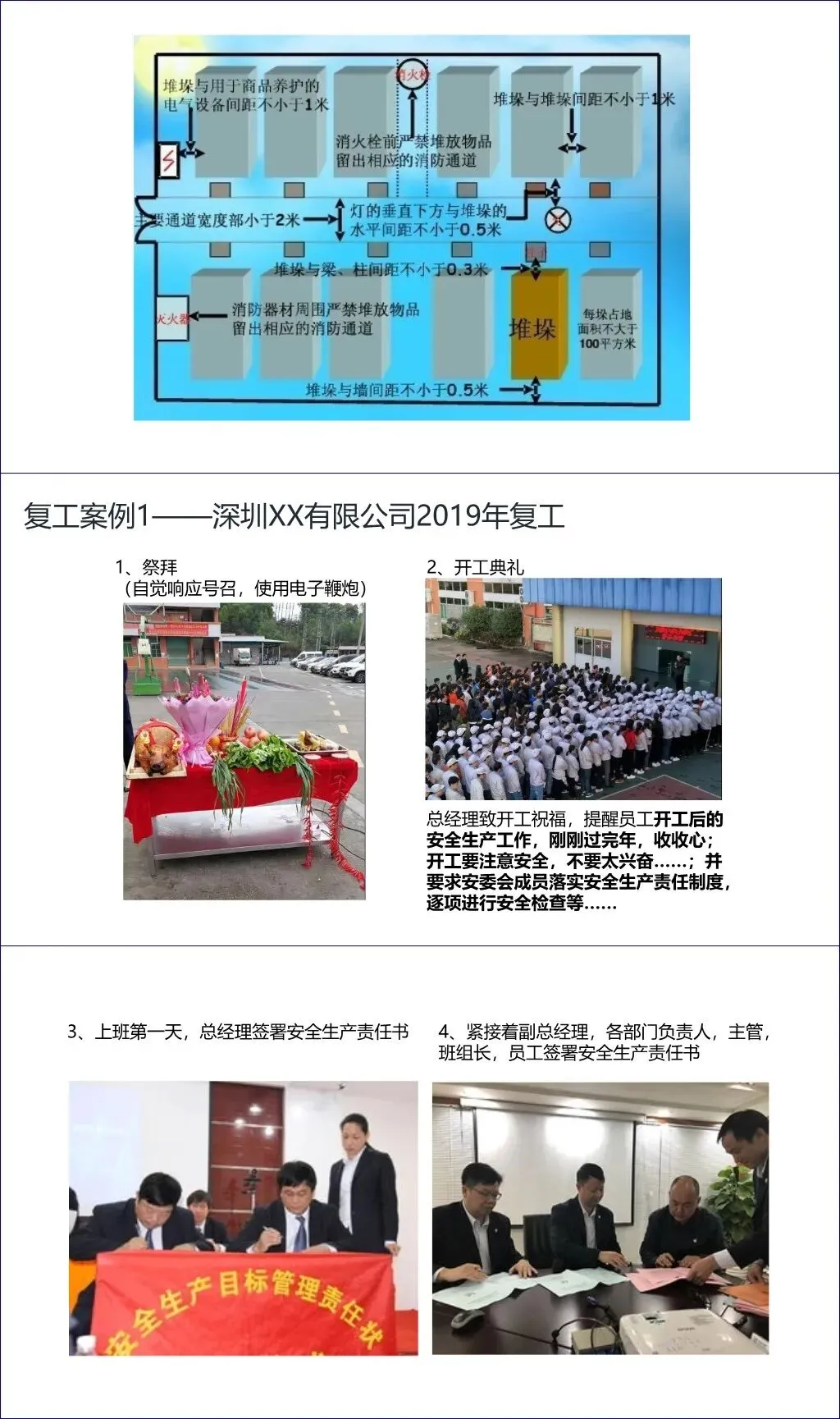 案例示范: 列举了深圳某公司的复工流程,包括祭拜(电子鞭炮)、开工典礼、签署责任书、分层级安全检查及全员警示教育培训。
