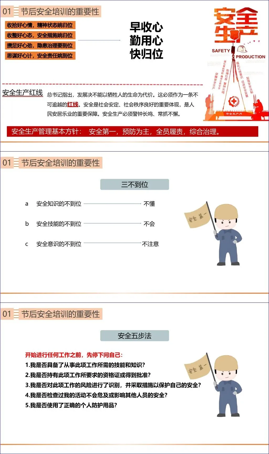心态调整:提出员工需做到“早收心、勤用心、快归位”,确保精神状态、安全措施、隐患治理和安全责任“四个到位”。