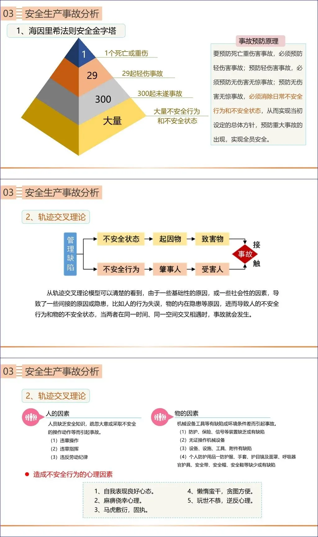 理论模型:介绍了“海因里希法则”(1:29:300比例,强调消除不安全行为和状态)和“轨迹交叉理论”(人的不安全行为与物的不安全状态在时空交叉导致事故)。