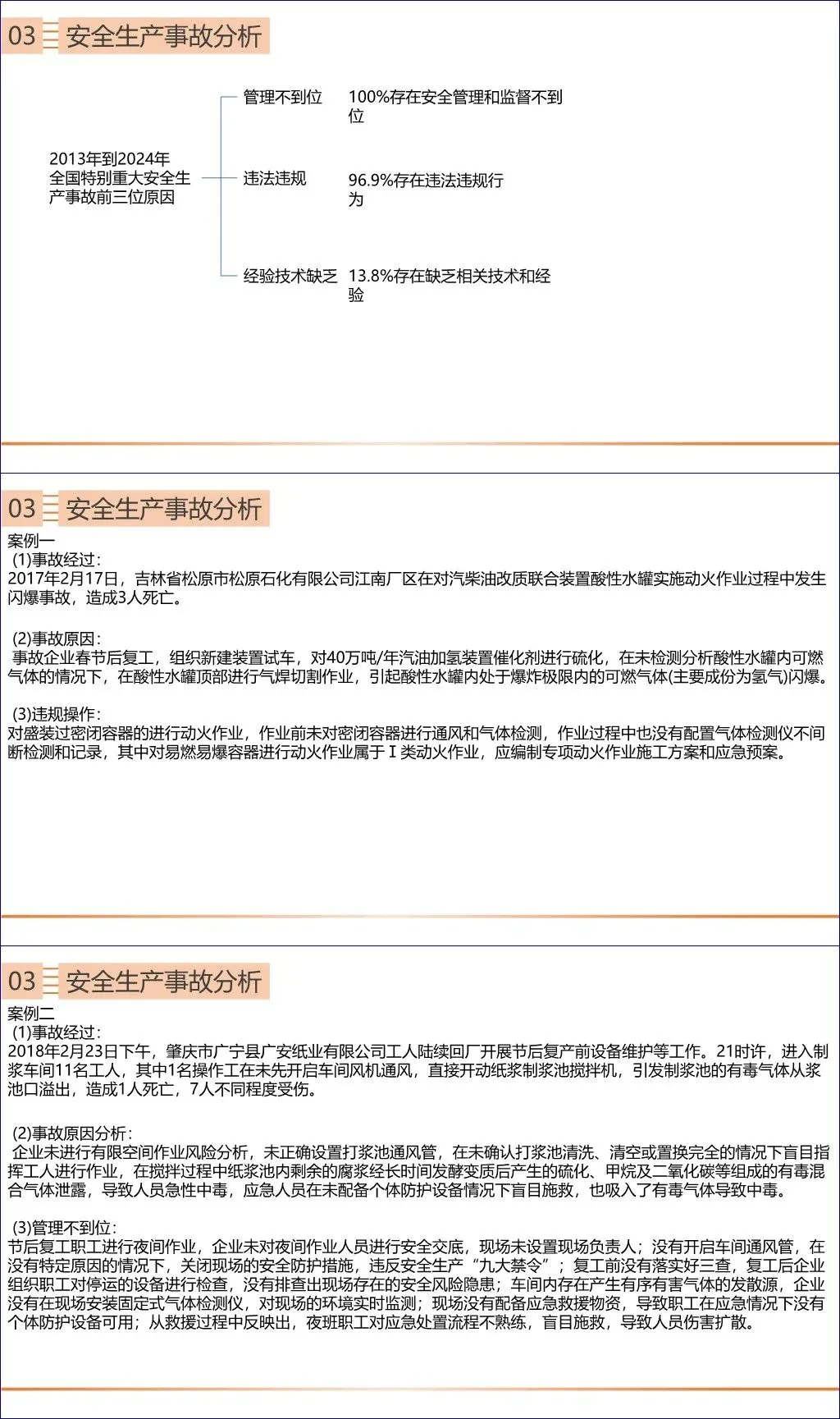 事故原因:分析了人的因素(违章操作、指挥、违反纪律)和物的因素(设备缺陷、防护缺失)。特别指出了麻痹侥幸、懒惰蛮干等心理因素。