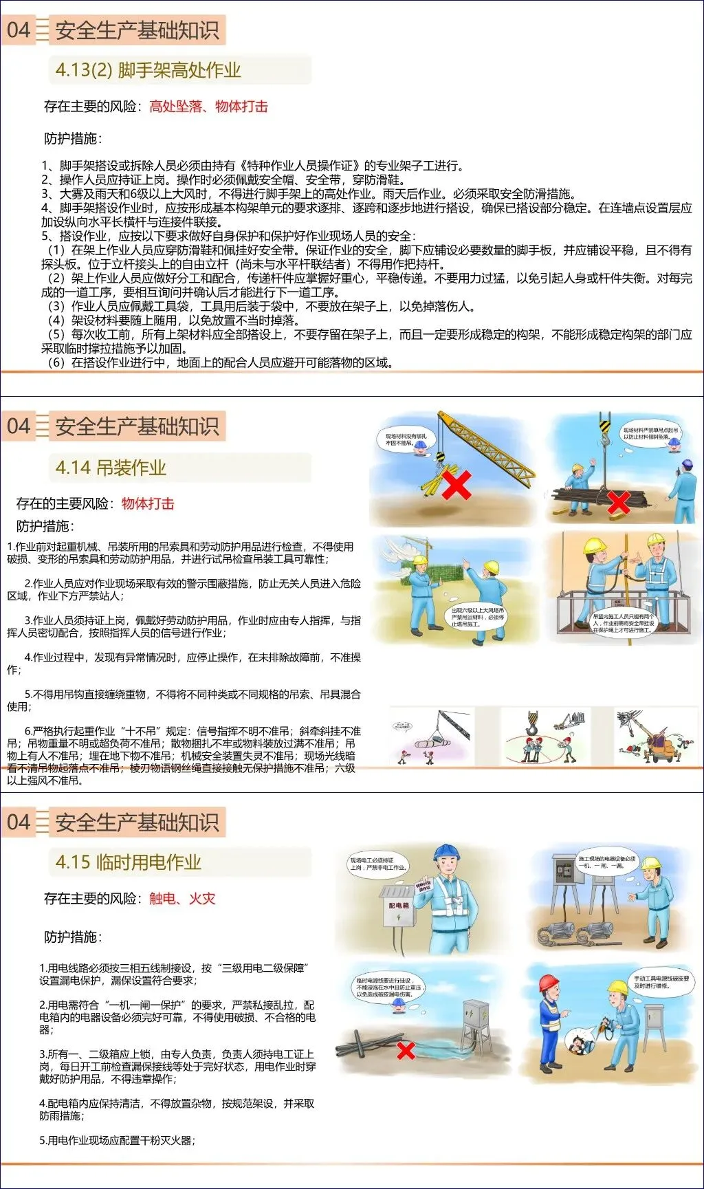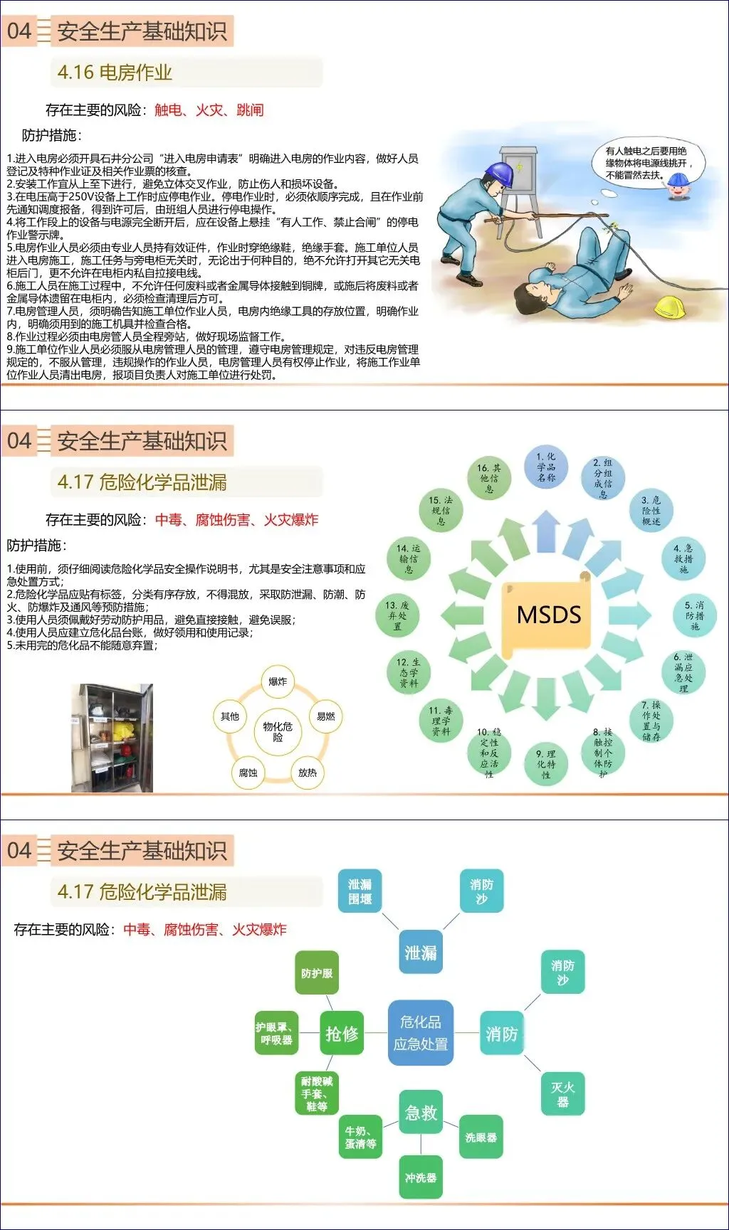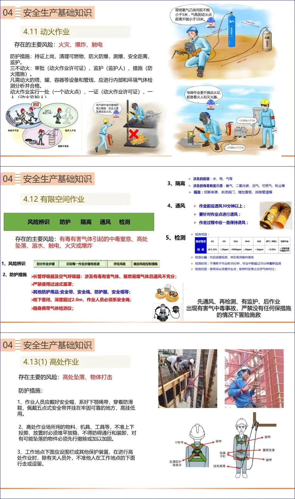 危险作业管控:详细列出了动火、有限空间、高处、吊装、临时用电、电房作业、危化品泄漏及机械伤害的风险点及具体防范措施。