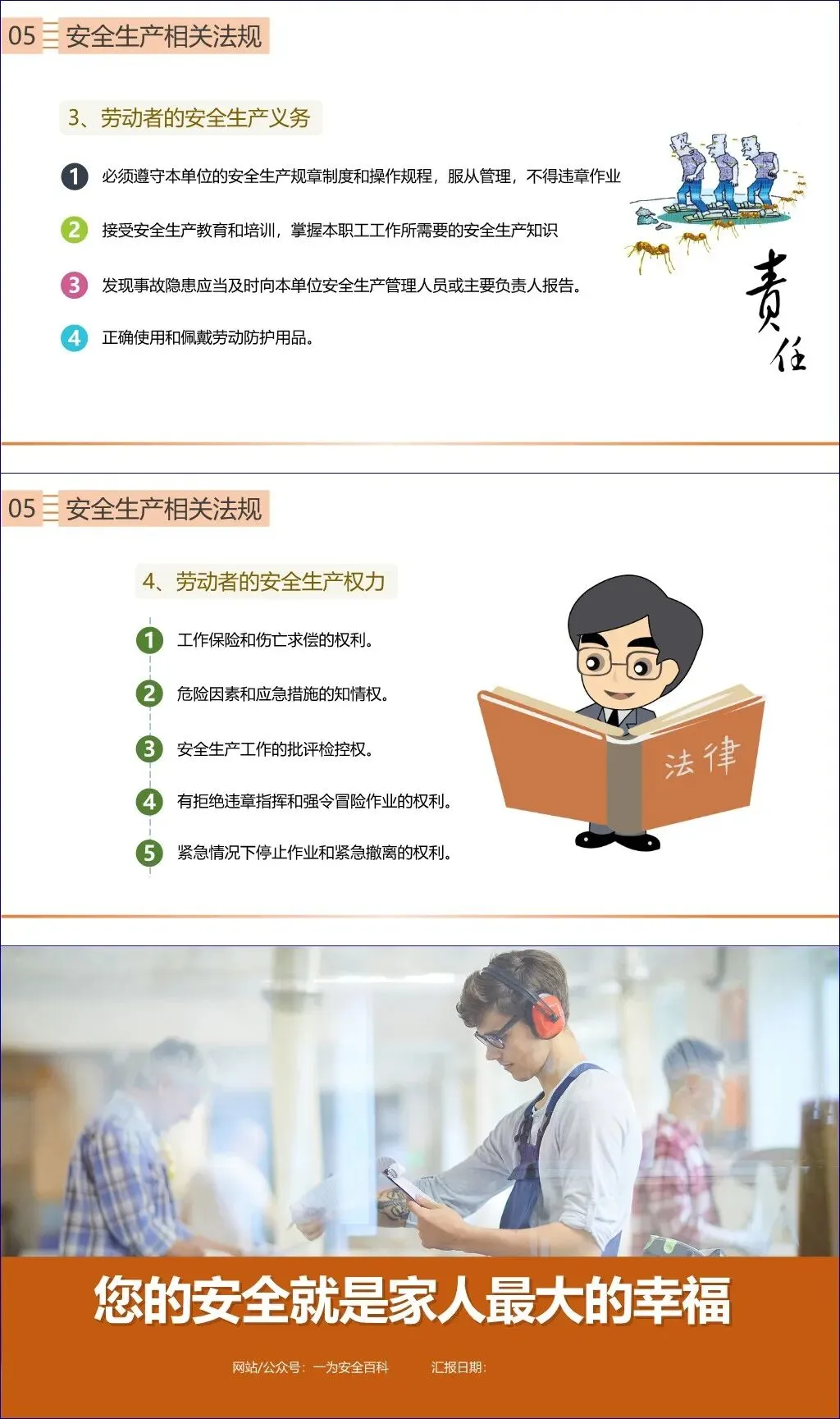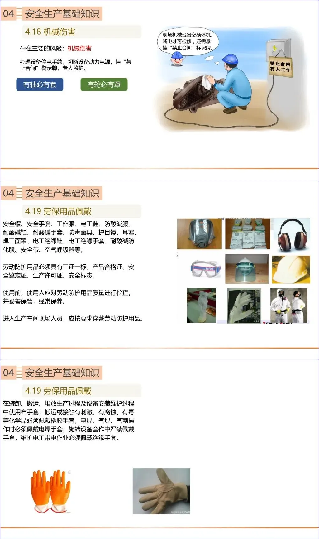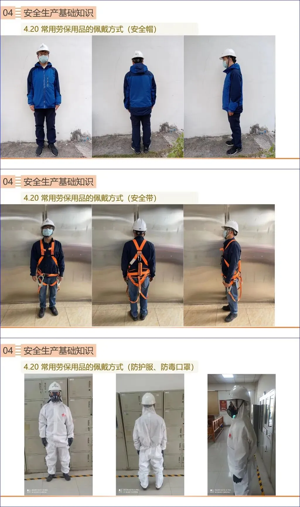 劳保用品:介绍了十大类防护用品,强调“三证一标”,并展示了安全帽、安全带等的正确佩戴方式。