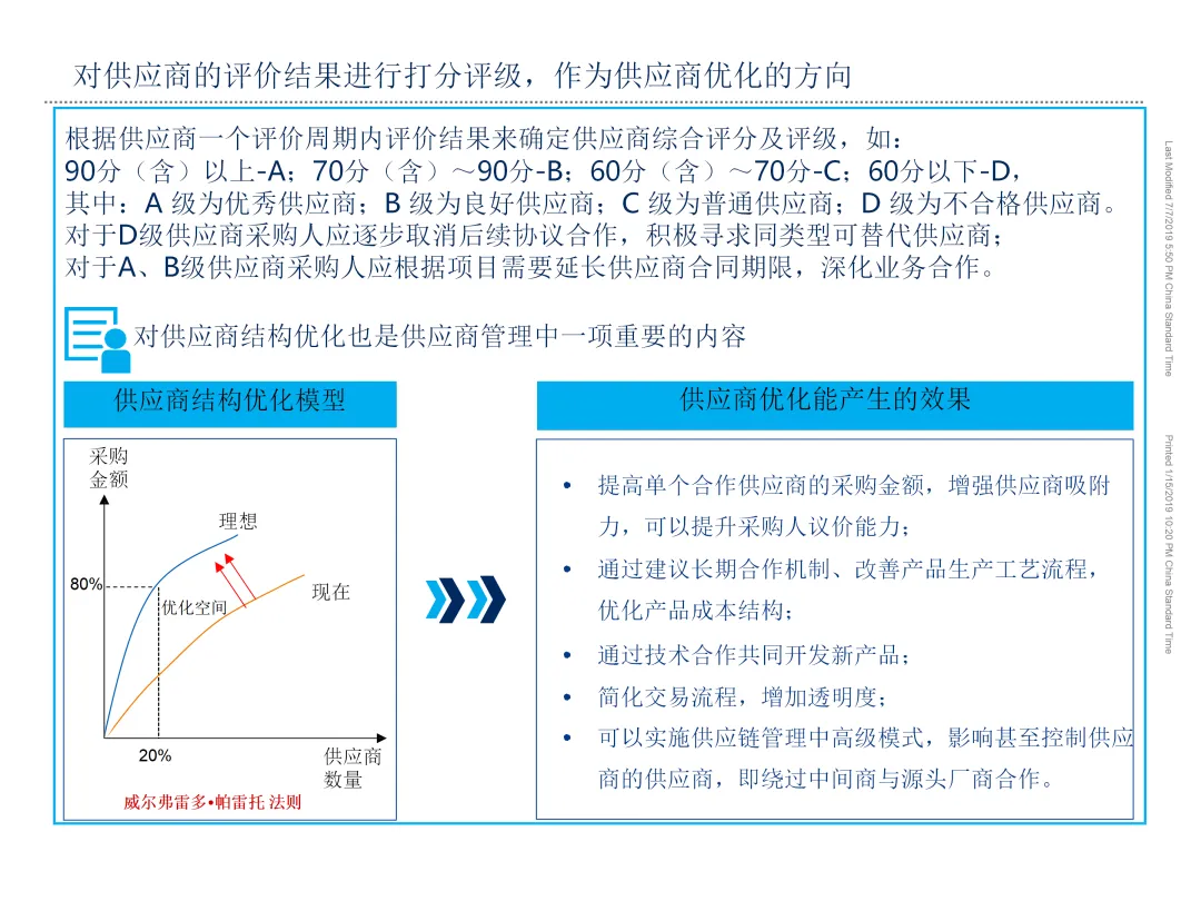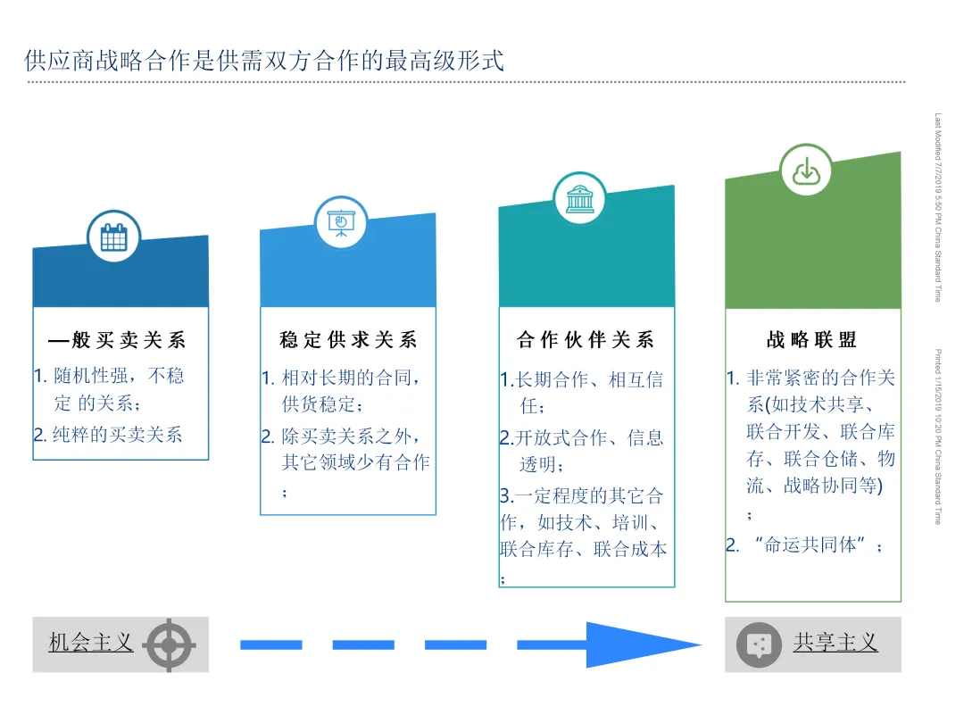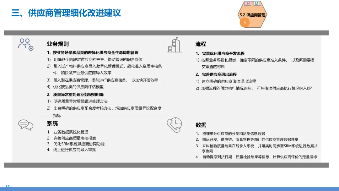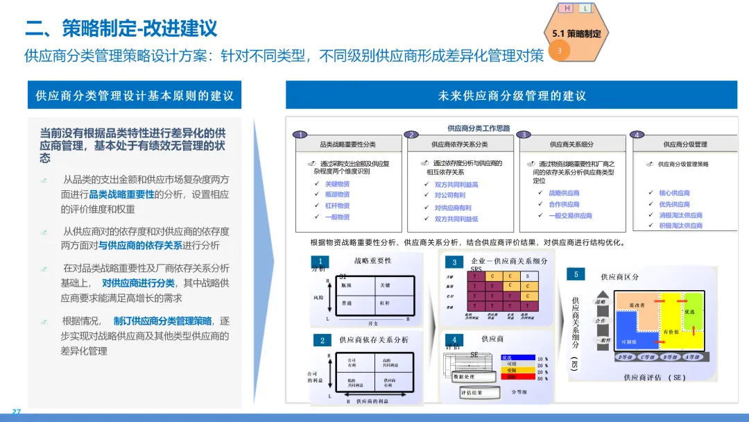 基于支出分析与市场洞察,将采购品类划分为战略型、杠杆型、瓶颈型与常规型四类,分别制定差异化管理策略。同时,构建分层分类的供应商管理体系,包括准入评估、绩效监控、关系深化与退出机制,打造高绩效、高韧性的供应网络。