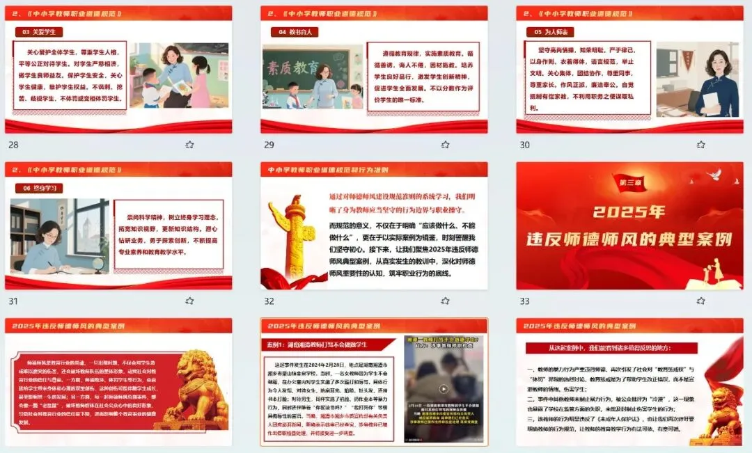 44页精美PPT搭配8500余字配套讲稿,分为四个核心内容:师德师风重要论述学习、教师职业行为准则、2025年违反师德师风案例及工作要求。图文搭配合理,讲解生动易懂。