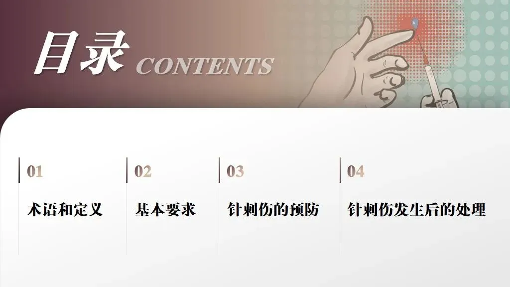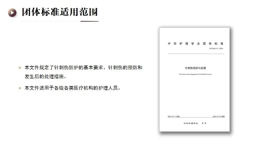 当前位置:首页>PPT>【PPT】针刺伤预防与处理——中华护理学会团体标准 T/CNAS 41─2024 解读