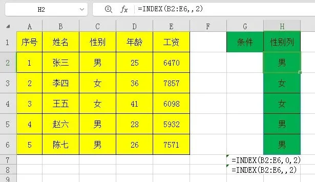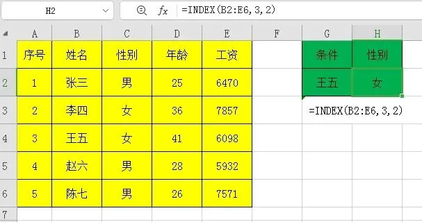 区域 B2:E6 中,第 3 行、第 2 列的内容(王五的性别)先别急,这只是基础用法,等学完 MATCH,你就知道 INDEX 有多香。例子2:返回整行或整列数据