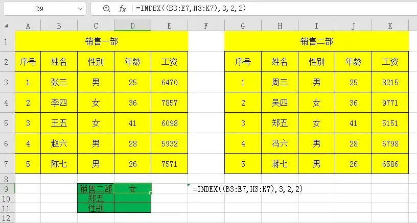 =INDEX((B3:E7,H3:K7),3,2,2)这种多区域用法实际工作中用得比较少,不如直接选中对应区域更简单直观。四、小结一下