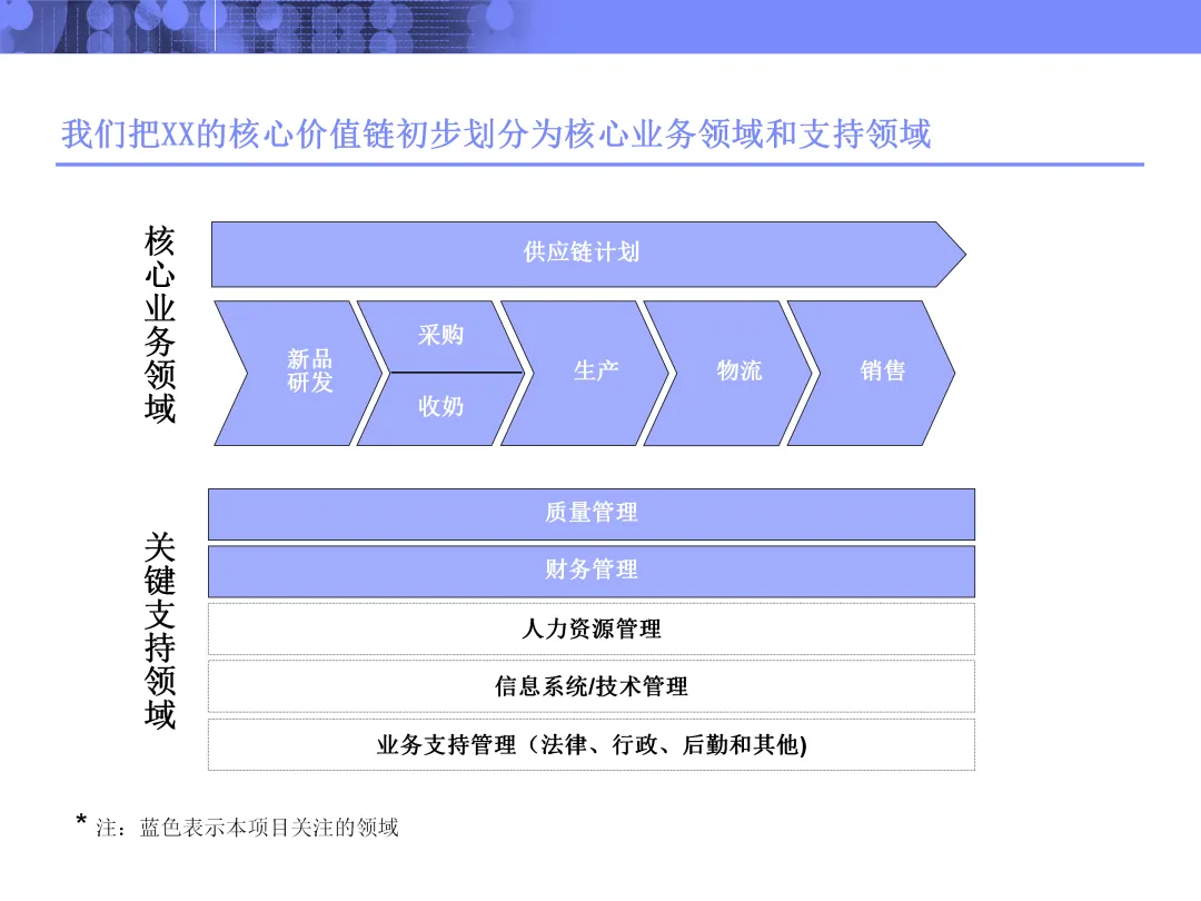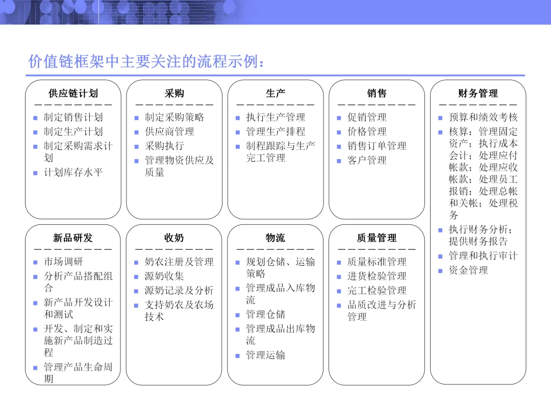在梳理价值链时,项目将活动清晰划分为核心业务领域与支持领域,并进一步聚焦关键流程,例如新品研发、采购执行、供应链计划、收奶与物流等。每一个流程并非孤立存在,而是通过输入输出相互连接,形成端到端的业务流。这种全景视角有助于识别断点与冗余,避免局部优化带来的整体损耗。