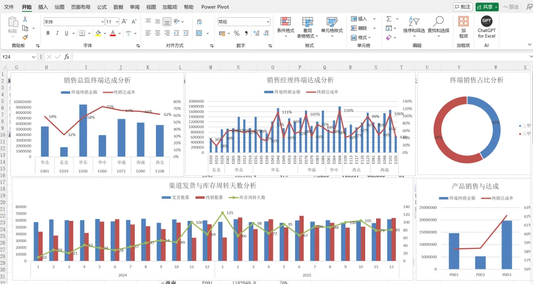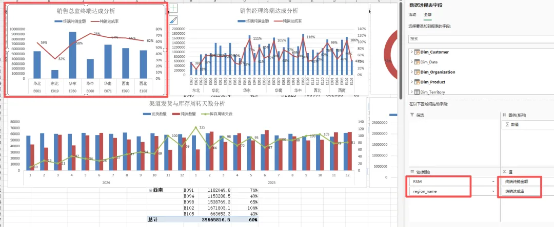 完成组织架构图之后,接下来就是组织架构图与终端纯销数据表进行建模关联,如下图,是组织架构表与终端绩效目标与终端纯销之间的建模关系最后在Excel或者Power BI中使用数据源来自数据模型,这里以Excel为例,如下查询数据透视表,数据源来自数据模型,在行中放入RSM与对应的区域,值放入终端纯销与达成率,达成率需要通过计算得到,结果如下图,其余的数据透视表与可视化分析都是类似的过程,这里不一一赘述。