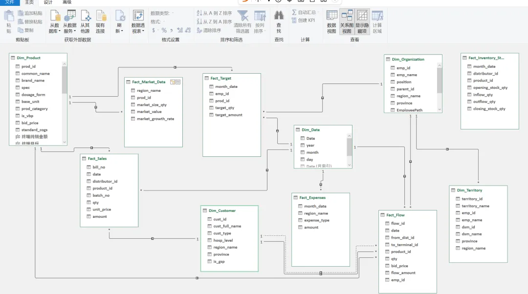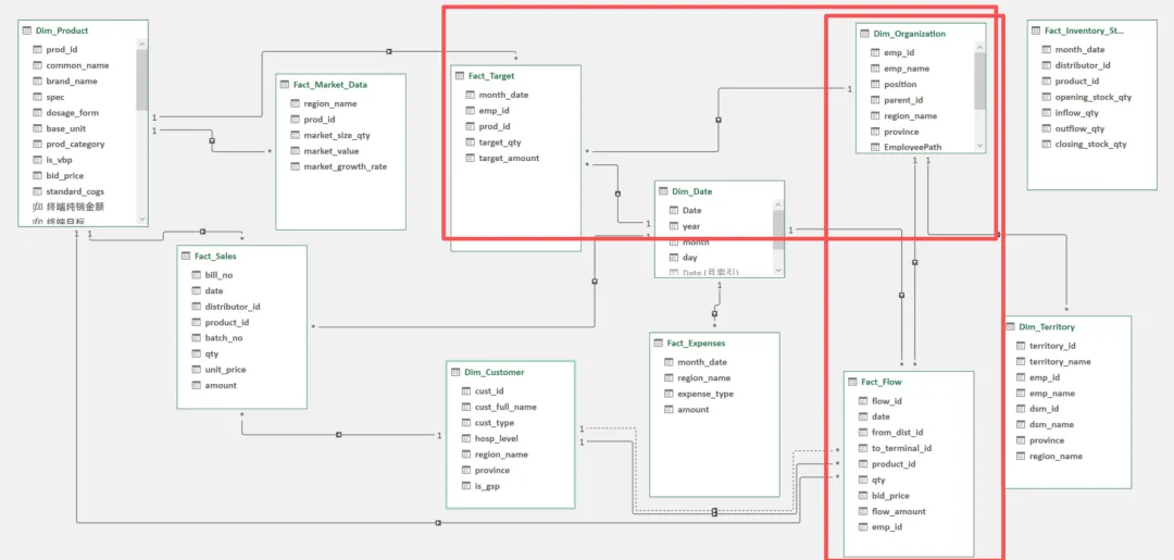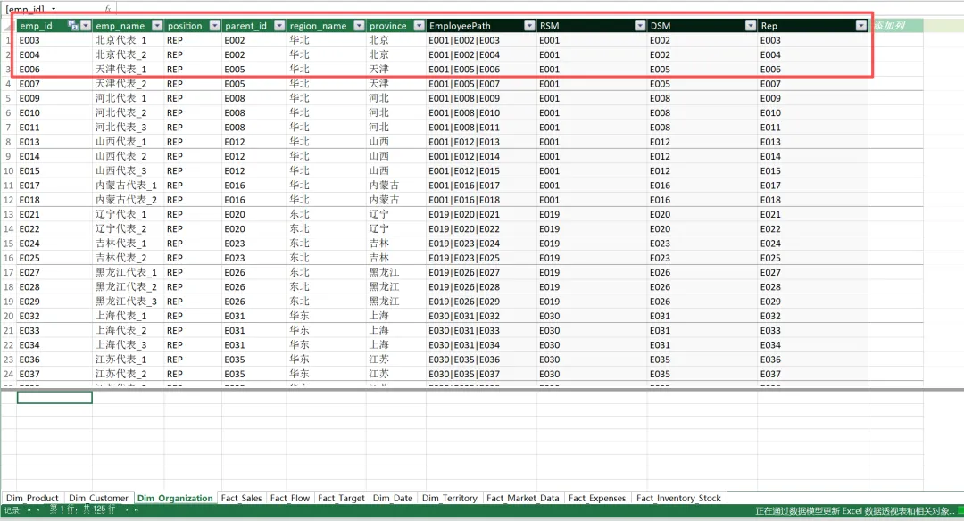 在前面已经完成了市场,渠道与终端的Power BI+AI诊断分析报告,具体参考如下接下来通过Excel+Power BI进行渠道与终端绩效实操案例,Excel建模版本效果图如下,上方左侧与中间是销售总监与销售经理的终端纯销达成分析,右侧是终端属性份额占比。下方是渠道发货与库存周转天数分析及产品销售达成分析。在做实操中,首先需要熟悉理解表结构,如下是销售团队的组织架构图,在这个组织架构图中,有emp_id与parent_id字段,分别对应销售岗位及对应的上级,通过这两个字段,能形成多层结构的销售组织架构,这里根据实际场景给出二层,分别是销售代表与对应的销售经理,销售经理与对应的销售总监,然后通过函数将对应的销售总监,销售经理,销售代表分别提取出来,形成三列,对应于RSM(销售总监),DSM(销售经理),Rep(销售代表),=PATH(Dim_Organization[emp_id],Dim_Organization[parent_id])