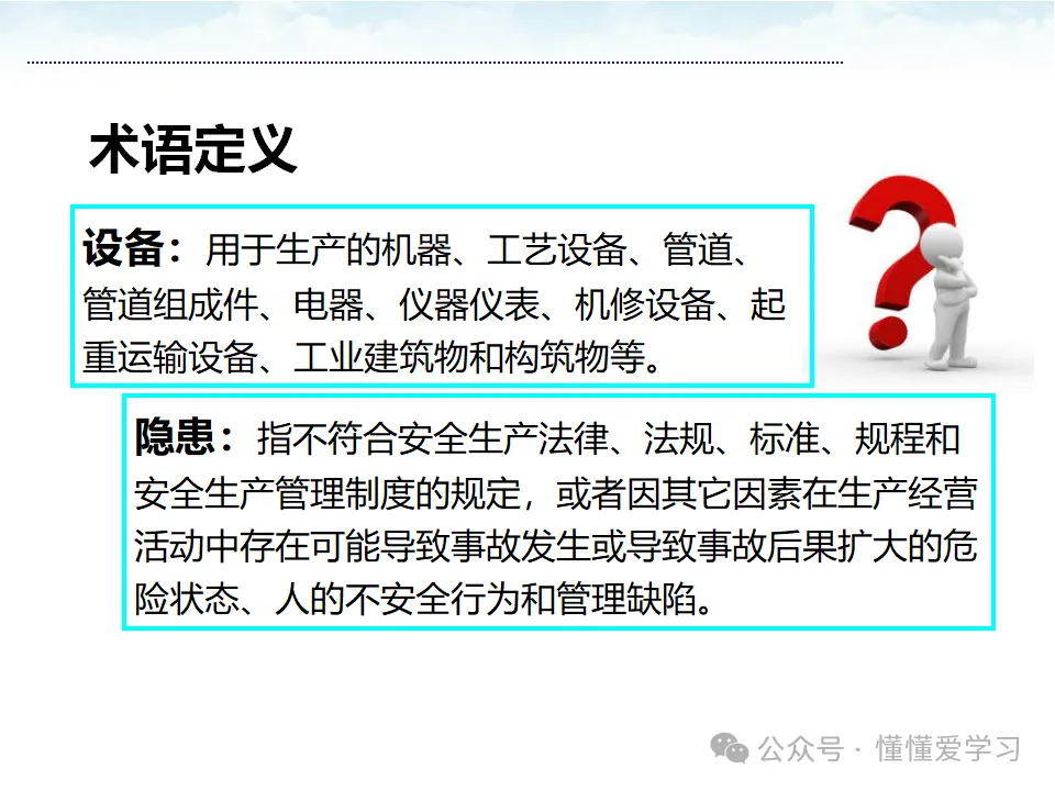 事故隐患,简而言之,是指生产经营活动中存在的可能导致人身伤害或财产损失的不安全状态、人的不安全行为或管理上的缺陷。这些隐患可能源于设备设施的缺陷、作业环境的恶劣、人的不安全行为或管理上的疏忽。它们如同隐藏在生产过程中的“定时炸弹”,随时可能引发事故,对人员和财产造成损害。