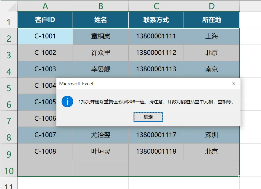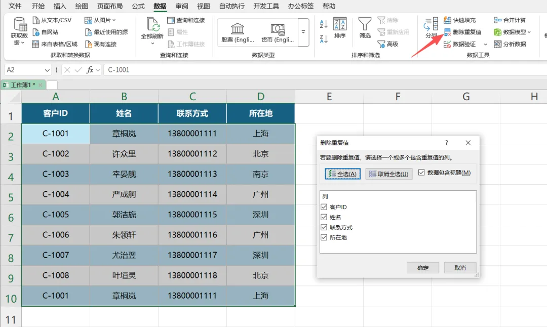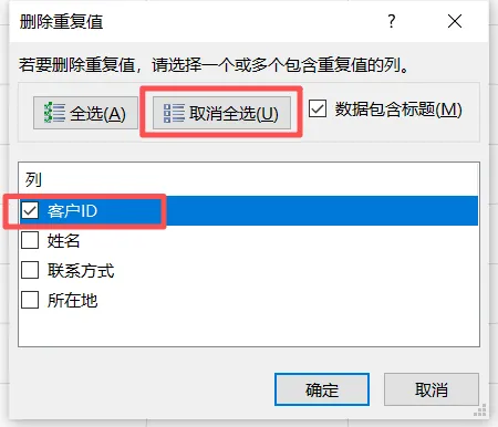 - 弹窗中取消“全选”,只勾选能标识唯一的列(比如“客户ID”),点击【确定】。