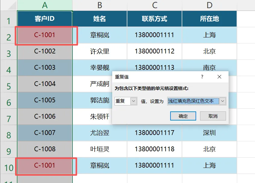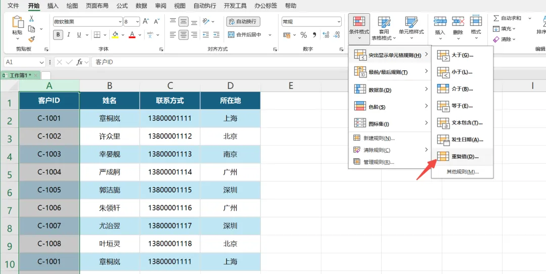 - 选中要查重的列(比如“客户ID”列),点顶部【开始】选项卡→右侧【条件格式】→【突出显示单元格规则】→【重复值】。