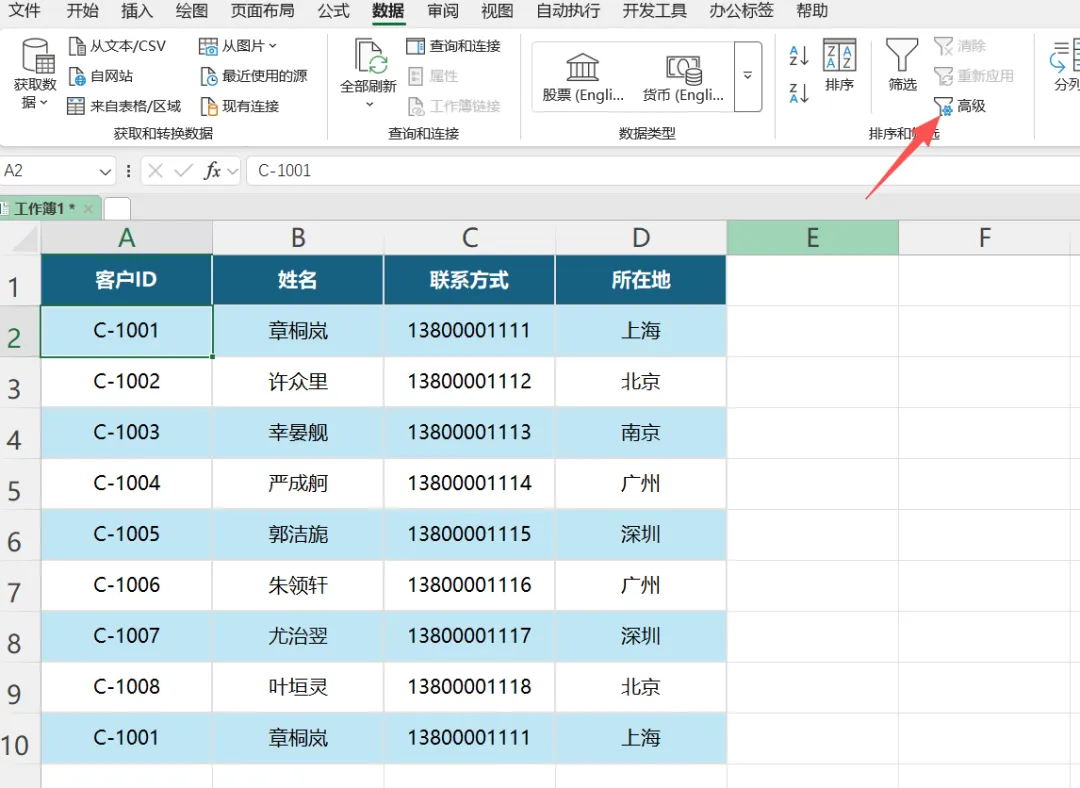 - 选中数据里任意单元格,点【数据】选项卡→右侧【高级筛选】。