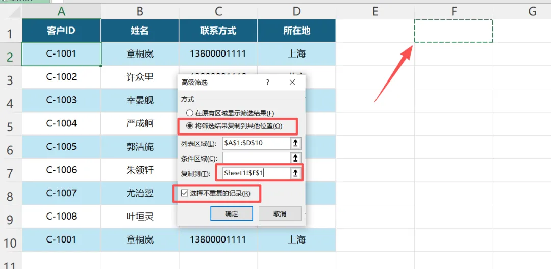 - 弹窗选“将筛选结果复制到其他位置”,目标区域选个空地方(比如F1),勾选底部【不重复的记录】,点【确定】。很简单,跟着选就行。