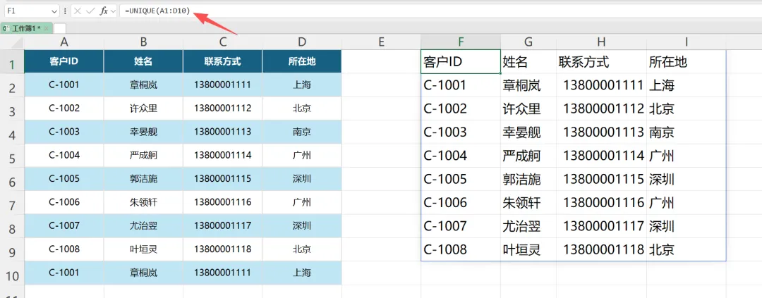方法四:用UNIQUE函数动态去重(适合数据会变的情况)- 选个空白单元格,在公式栏输入“=UNIQUE(”,然后框选整个数据区域(比如A1:D10),括号闭合后回车。