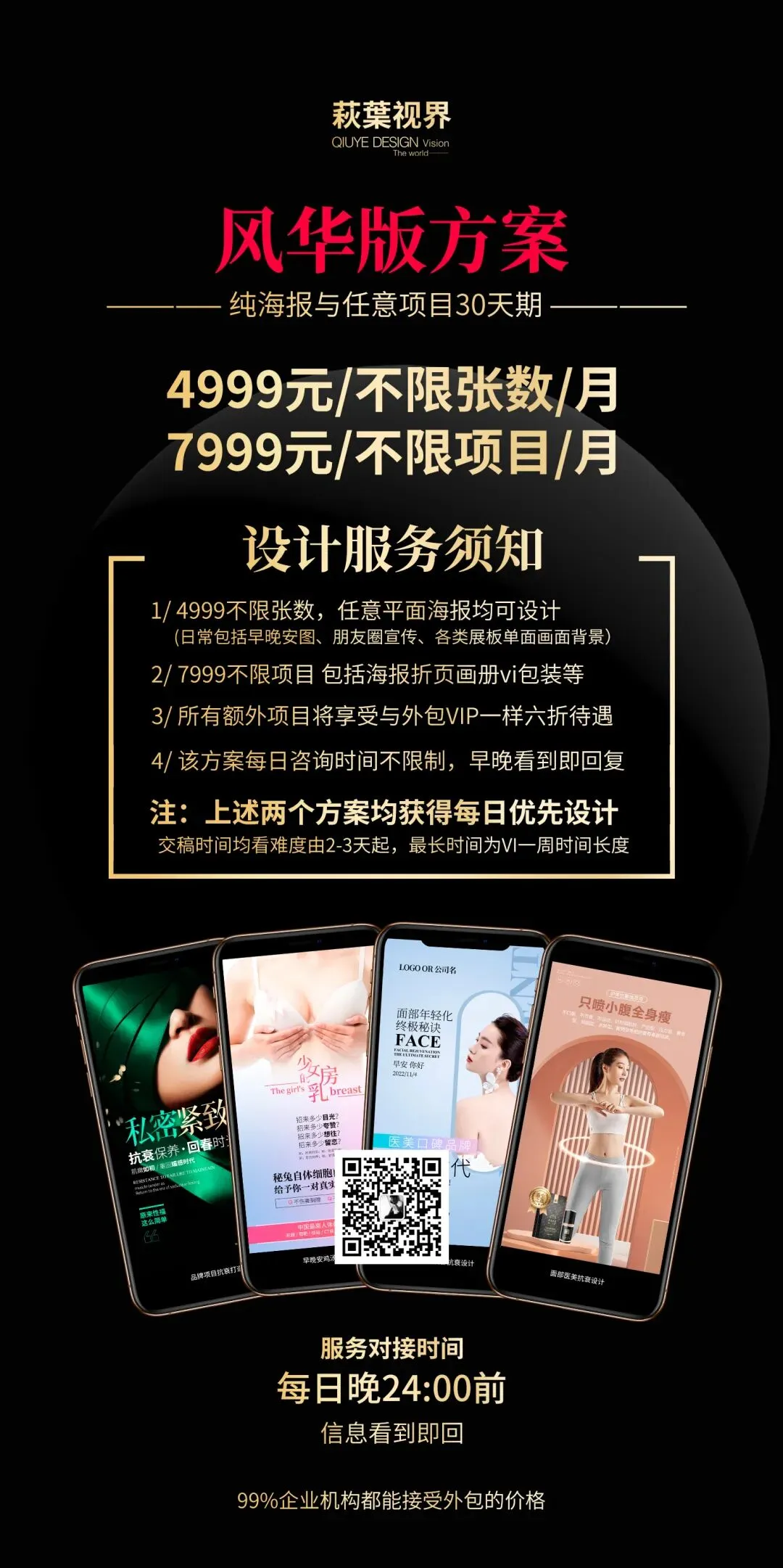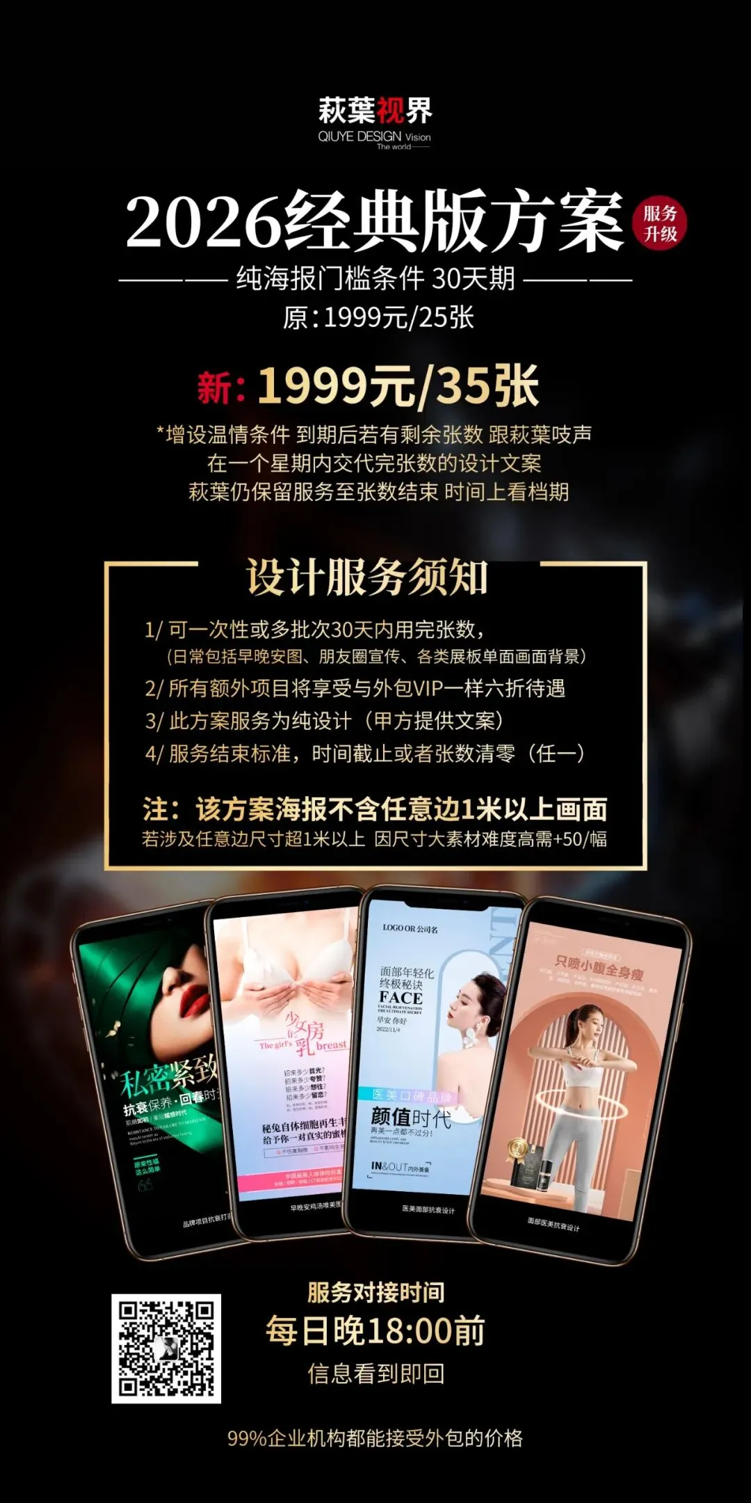 全日制一对一服务,致力协助打造高端私密品牌,重塑私密行业的标杆!VIP包月服务贴心,重点板块涉及医美医疗、医美私密、面部抗衰等,包括早晚安图、医美知识点、医美品牌海报、节假日海报、个人IP打造海报、线下会务会场、会所展板展架、画册logo等服务项目。