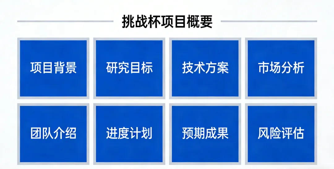 毫不夸张地说,项目概要页是你项目的黄金浓缩名片。挑战杯评审现场,评委一天要审阅几十个项目,根本不可能逐字逐句看完你20页PPT的每一个细节,很多时候,他们会先通过这一页概要,快速判断你的项目有没有核心亮点、值不值得深入了解。能不能抓住评委的注意力,让他愿意继续听你讲完整个项目,全看这一页做得够不够到位。