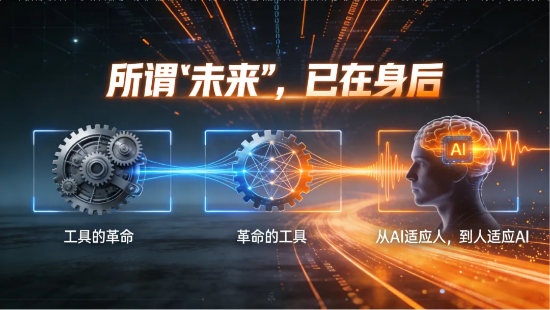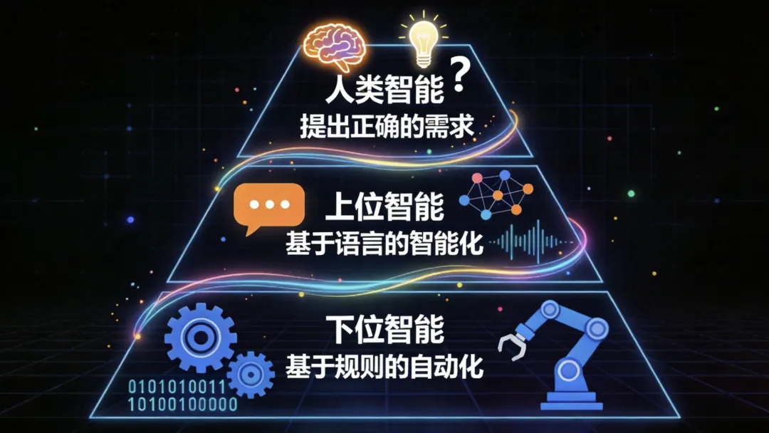 第二步,打开DeepSeek,用下文的提示词,让它帮忙生成几组“文生图”提示词。这里有一个技巧,就是一开始的时候,AI生成的画面我不是太满意,但是也有让我满意的。我就不断搜集满意的提示词和我认为很糟糕的提示词,滚动添加到提示词里。大量正面示例和反面示例的加入,使得DS的产出质量,出片率越来越高。第三步,把提示词发给豆包生图。豆包生图是免费的,所以可以快速看到提示词的构图、风格是否令人满意。不满意也不花钱,不心疼。第四步,如果豆包画的图能用,就直接用吧。如果豆包画的图有一些瑕疵,那么我会用即梦的4.5模型,再次生成图片。即梦4.5的生图效果会比豆包稳定优质一个小台阶。最后,即梦生图,我直接截图;而豆包的生图,还需要用去水印工具去除一下水印,就可以用了。任务目标我为你提供一个ppt的文字内容,请你基于其中的文字信息,生成3个中文“文生图”提示词(16:9比例),用于驱动另一个AI绘制一张PPT设计图。具体要求PPT类型一句话PPT:主标题突出,占据视觉中心,画面围绕标题构建场景或装饰(文字是最重要的,画面不能抢了文字的表现)常规内容页PPT文字内容如下所谓“未来”,已在身后工具的革命革命的工具从AI适应人,到人适应AI内涵与主题提炼根据文字内容,分析其核心主题、情感基调或想要传达的关键信息。PPT设计构想设计一个合适的视觉方案,要求能准确反映图片的内涵与主题。重点考虑排版布局、色彩搭配、字体选择、图形装饰等元素,使整体设计既美观又符合内容气质。ppt必须不折不扣地体现用户提供的文字内容文生图提示词生成基于你的设计构想,生成3个不同的“文生图”提示词,每个提示词需独立、完整地描述PPT的视觉设计,以便另一个AI直接生成对应的PPT图像。提示词语言:中文图片比例:16:9方案数量:3个备选方案,每个方案应有所区别(如不同布局风格、配色倾向等)。注意:避免极简风(但不要在返回给我的提示词里写“避免极简”)如果需要写“二进制代码‘01’图案”,不要写01,文生图工具会误解,写“二进制代码图案”即可避免使用以下背景配色或类似的背景配色:背景为米黄色到浅橙色的细腻渐变背景为米白色到浅橙色的细腻渐变输出格式首先,简要说明您从图片中读取到的信息及理解。然后,列出3个文生图提示词,每个提示词前用“方案一:”“方案二:”“方案三:”标注。输出提示词里,用纯文本,严禁使用md标记=============以下是我喜欢的例子,你可以参考=============常规PPT:一张16:9比例的PPT设计图,以冷静的蓝紫色为主色调,但搭配温暖的橙黄色作为文字和关键节点的点缀,避免整体失真。背景为深邃的深蓝色到蓝紫色的渐变,带有微光的科技网格和细小的数据流线。主标题“制作海报级PPT”使用极具力量感和现代感的无衬线粗黑字体,横向居中靠上,字体为亮白色到浅橙色的渐变,带有清晰的内发光,确保在深色背景下突出且不偏冷。画面主体是三个悬浮的、有科技感的发光信息节点或卡片,通过流动的光线从左到右连接,形成清晰的流程图。左侧节点代表“DeepSeek”,是一个半透明的蓝色立方体,表面流动着文字和代码,下方标签为“设计提示词”;中间节点代表“豆包”,是一个带有“免费”标签的圆形测试平台,发出柔和的黄色光晕,下方标签为“免费测试提示词效果”;右侧节点代表“即梦”,是一个立体的画框或显示屏形状,表面播放着色彩丰富、细节清晰的高质量海报画面,散发着暖色调的光芒,下方标签为“提供高质量画面”。节点之间连接的流动光线为白色到暖黄色的渐变,带有微小的粒子流动效果。整体风格偏向科技感和未来感,层次分明,强调流程与产出。(很有高级感)活力协作风常规PPT:一张16:9比例的PPT设计图,暖色调为主,主标题“用结构化提示词梳理需求”使用粗黑字体,居中上方,下方分左右两栏。左侧四个圆角卡片垂直排列,分别标有“角色”、“任务背景”、“任务要求”、“具体行动”,每个卡片配有简洁的线性图标;右侧三个彩色对话气泡上下堆叠,内文为“1. 对复杂任务,拆分关键执行节点”、“2. 对话时提供完整上下文”、“3. 与AI协作,持续优化提示词”,气泡之间用细线连接。背景为米白到浅橙的渐变,点缀半透明的六边形和圆点,整体风格现代商务,细节丰富,避免极简。常规PPT:一张16:9的PPT幻灯片,浅灰色背景,三张悬浮卡片水平并排。左侧卡片代表“下位智能”,卡片上显示文字“下位智能”“01 基于规则的自动化”,冷蓝色调,包含机械齿轮和电路图案。中间卡片代表“上位智能”,卡片上显示文字“上位智能”“02 基于语言的智能化”,暖橙色调,包含聊天气泡和语言符号。右侧卡片代表“人类智能”,卡片上显示文字“人类智能”“03 提出‘正确的’需求”,活力紫色调,包含人脑轮廓、灯泡和问号。每张卡片有轻微的3D等距效果和柔和阴影,下方留有空白的横幅位置(不添加文字,供后期编辑)。风格为扁平设计加渐变点缀,适合商务演示。常规PPT:一张16:9的PPT幻灯片,深色背景带有数字网格,采用垂直金字塔构图。底部区域代表“下位智能”,显示文字“下位智能”“01 基于规则的自动化”,视觉元素为蓝色机械齿轮、机械臂和二进制代码。中部区域代表“上位智能”,显示文字“上位智能”“02 基于语言的智能化”,视觉元素为橙色对话气泡、神经网络节点和语言波形。顶