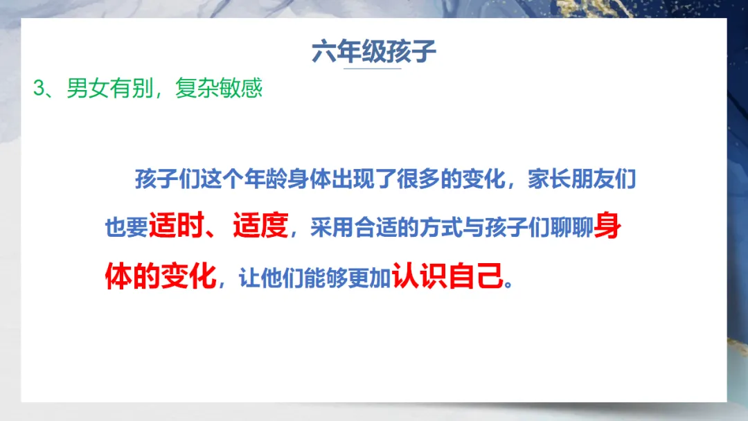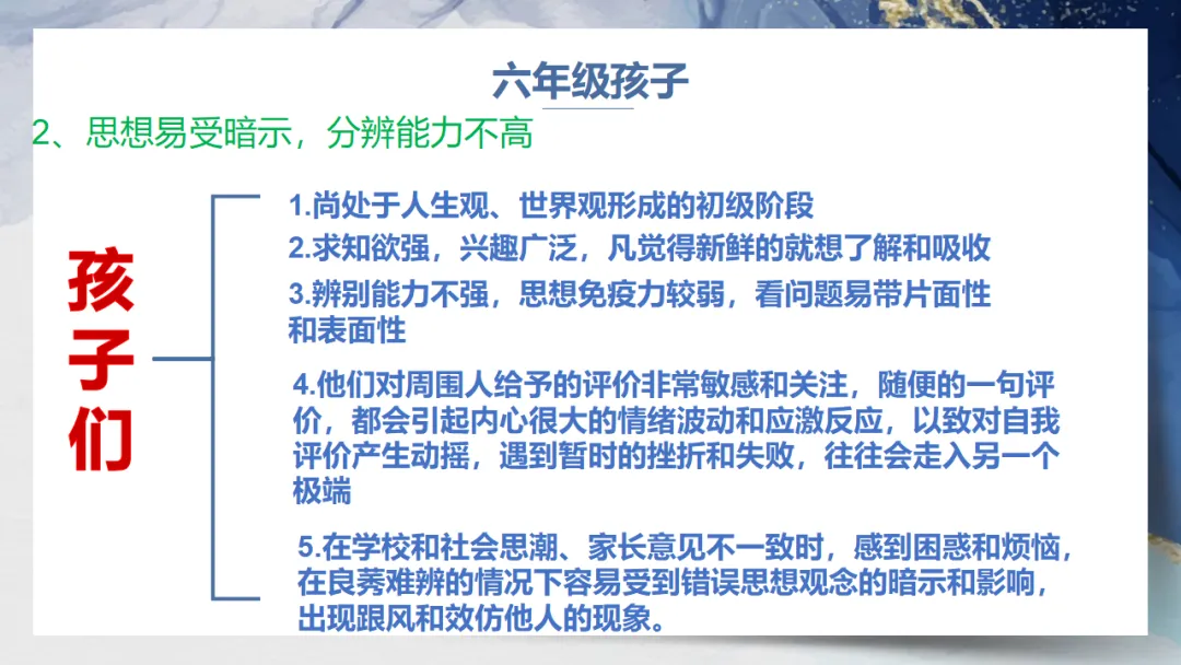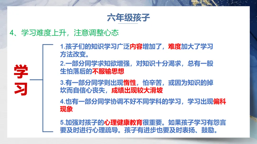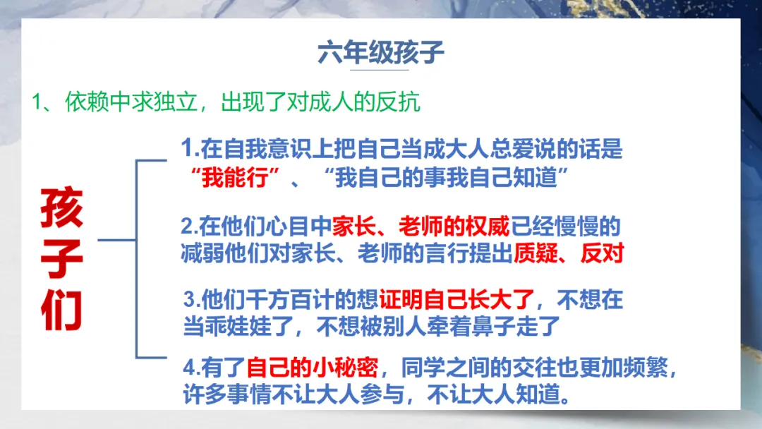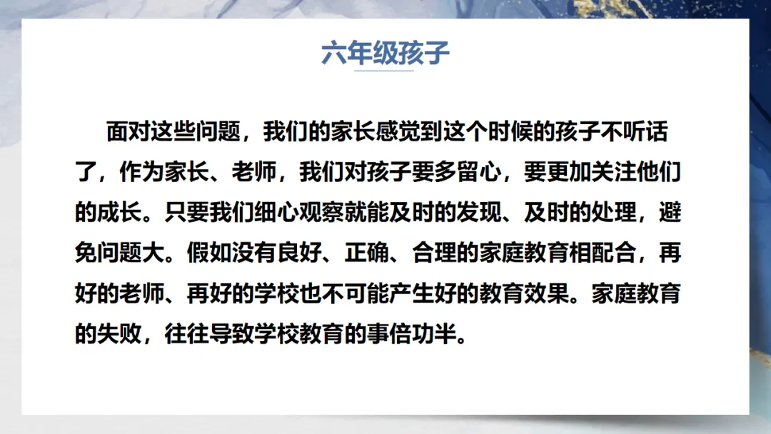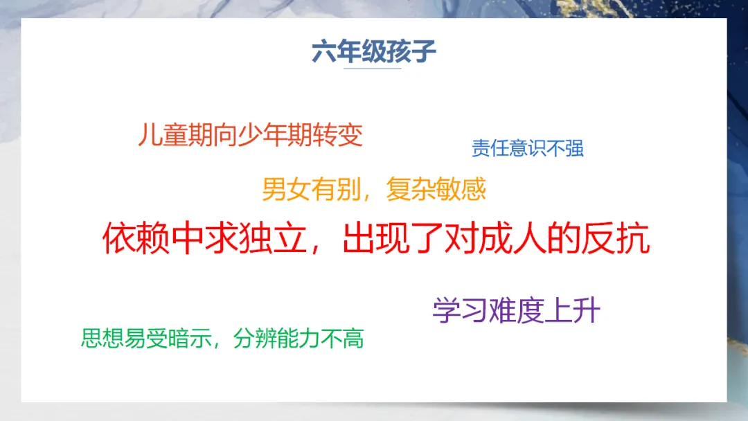 六年级孩子的自我意识开始形成,对事物有了自己的观点和看法,他们强烈需要老师和父母的的尊重,需要成人把他们当作大孩子。所以,我们会感到,四年级的孩子变得没有以前听话了,开始有点“叛逆”了。学习的时候三分钟热度,难以坚持;无所谓,不上心; 太贪玩;不爱学;爱分心,常走神……这一切都是因为缺乏内在的学习动力