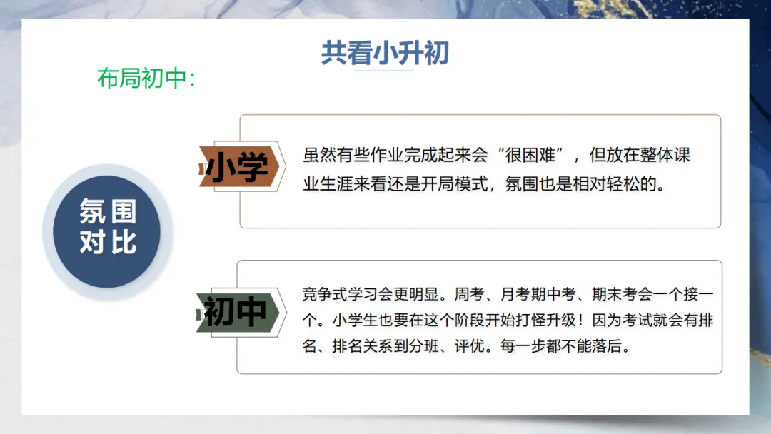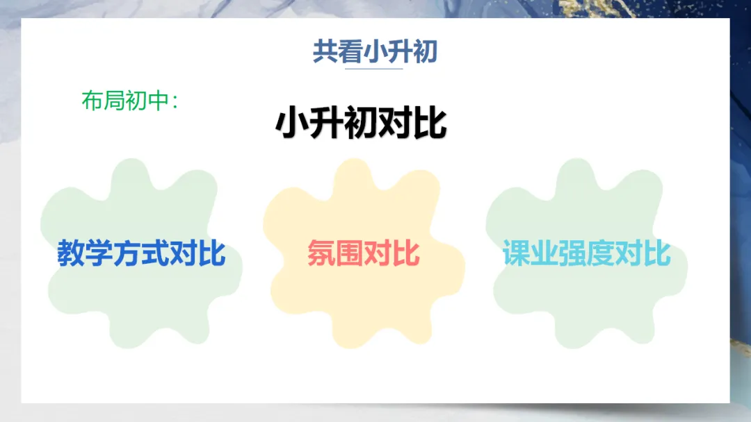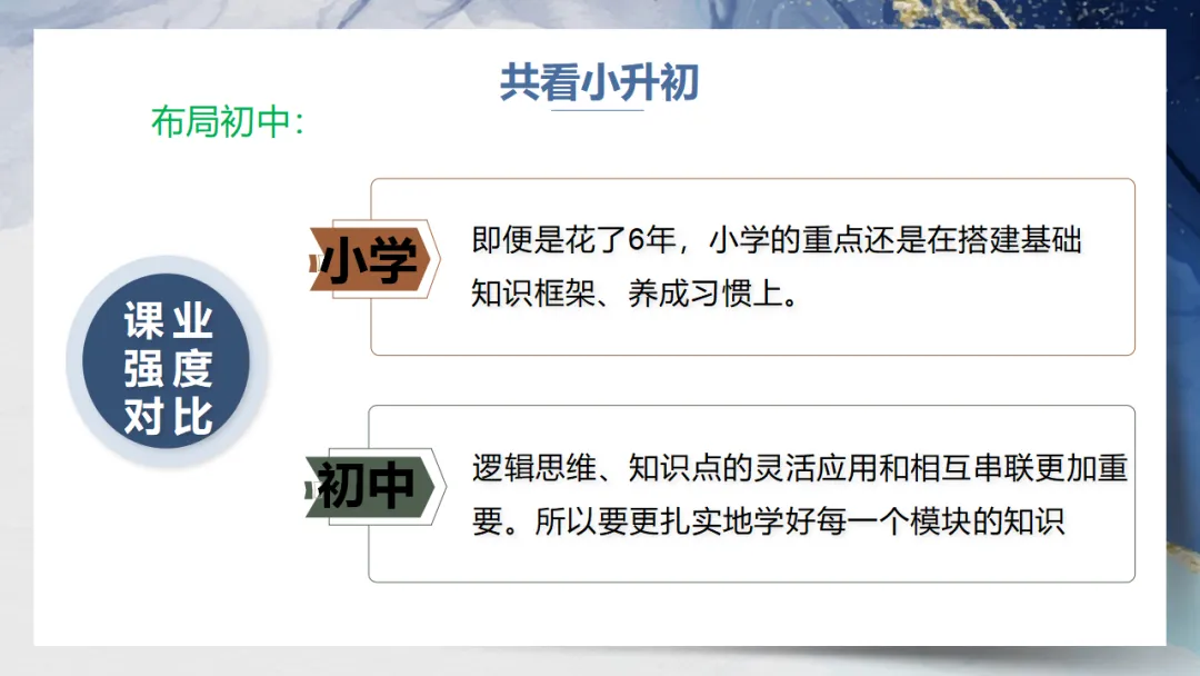 那我们从教学方式、学习氛围、课业强度三个方面将小学和初中进行对比。