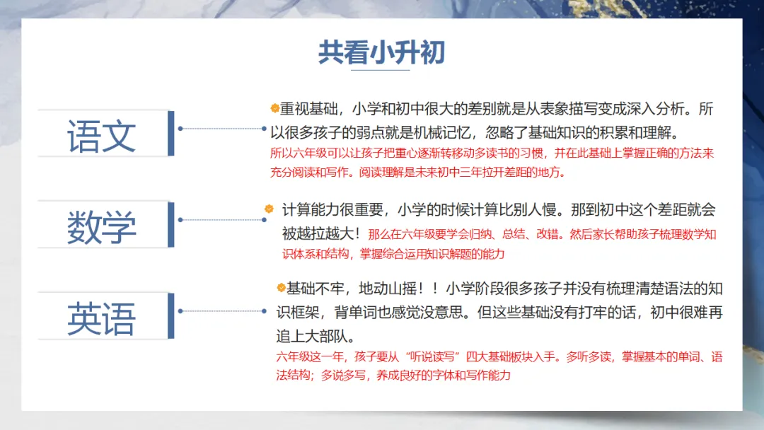 英语:基础不牢,地动山摇!!小学阶段很多孩子并没有梳理清楚语法的知识框架,背单词也感觉没意思。但这些基础没有打牢的话,初中很难再追上大部队。六年级这一年,孩子要从“听说读写”四大基础板块入手。多听多读,掌握基本的单词、语法结构;多说多写,养成良好的字体和写作能力