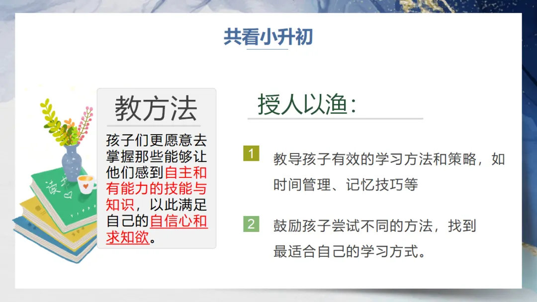 授人以渔:(1)教导孩子有效的学习方法和策略,如时间管理、记忆技巧等