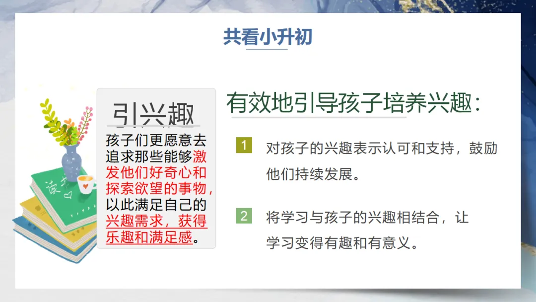 有效地引导孩子培养兴趣:(1)对孩子的兴趣表示认可和支持,鼓励他们持续发展。(2)将学习与孩子的兴趣相结合,让学习变得有趣和有意义。