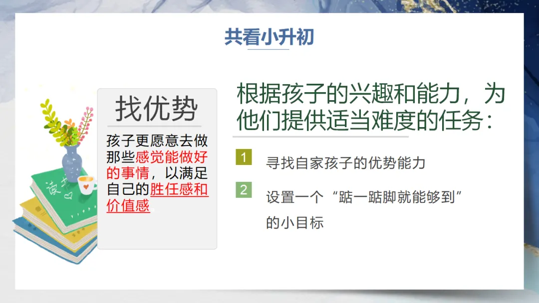 根据孩子的兴趣和能力,为他们提供适当难度的任务:(1)寻找自家孩子的优势能力(2)设置一个“踮一踮脚就能够到”的小目标。
