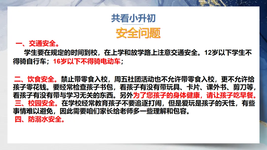 交通安全。学生要在规定的时间到校,在上学和放学路上注意交通安全。12岁以下学生不得骑自行车;16岁以下不得骑电动车;