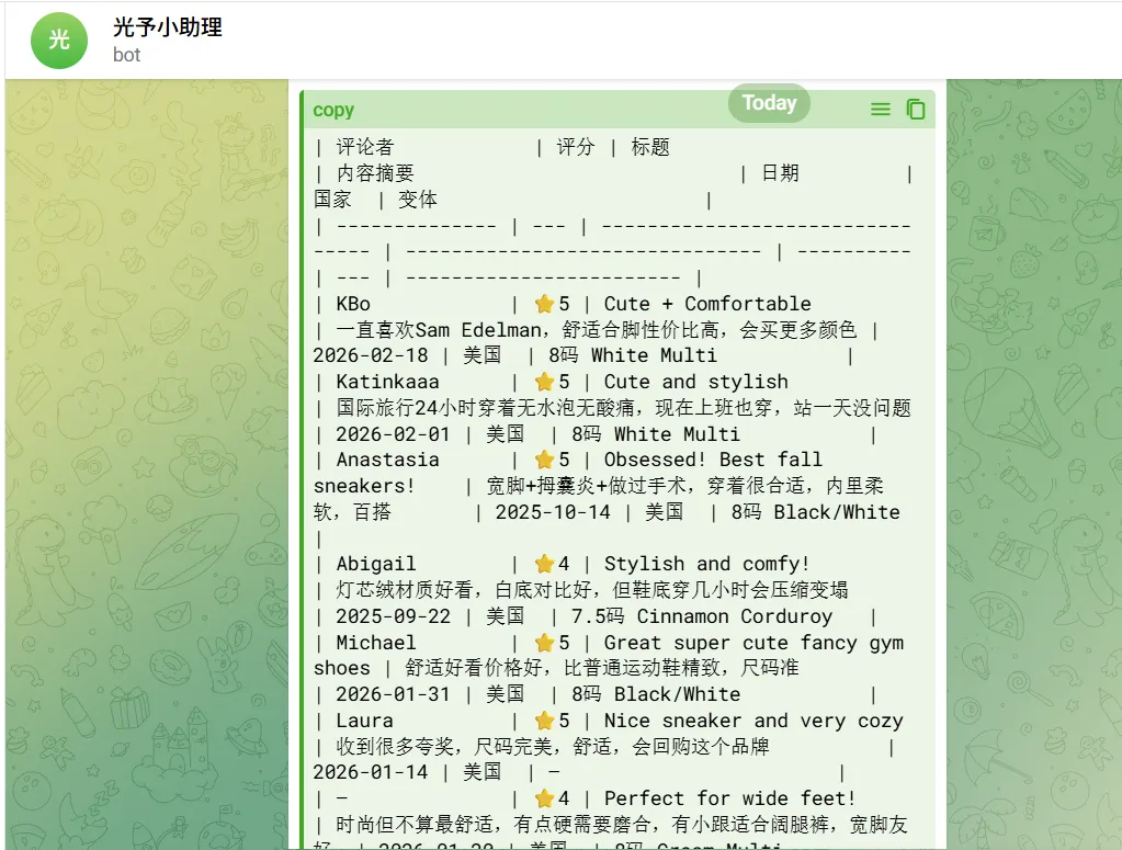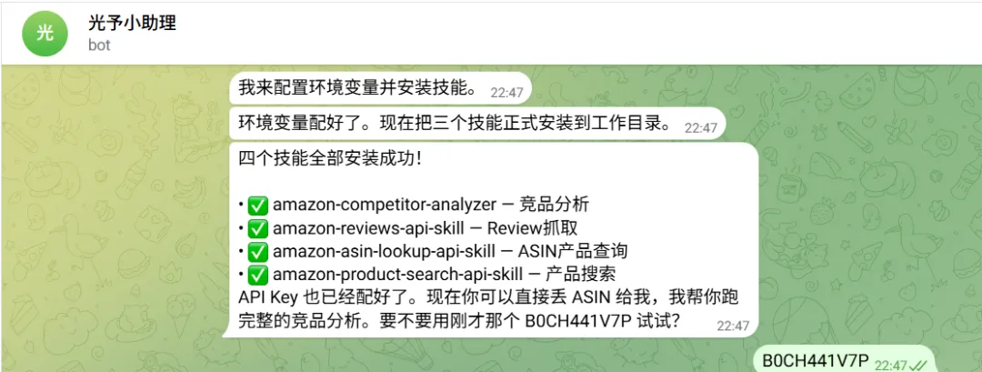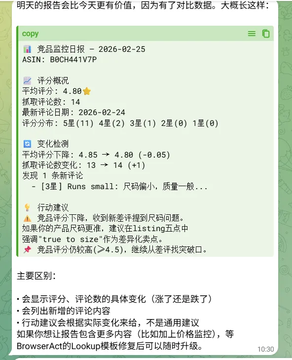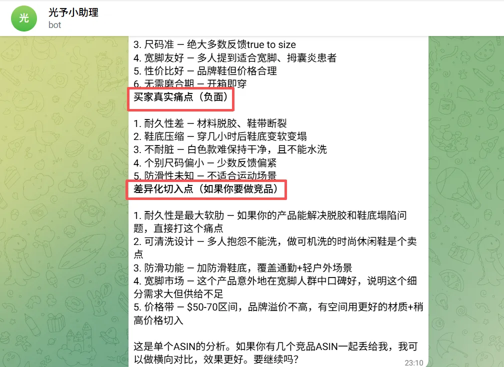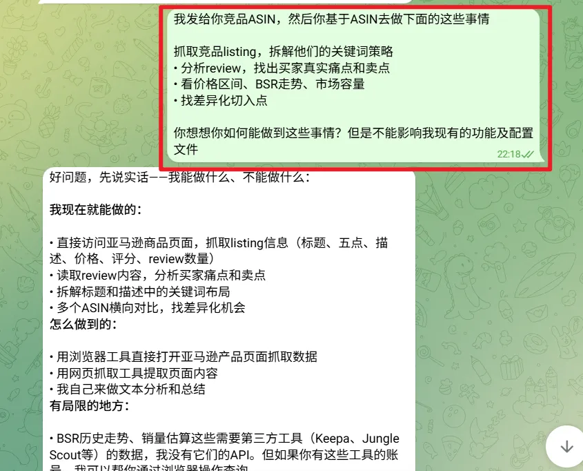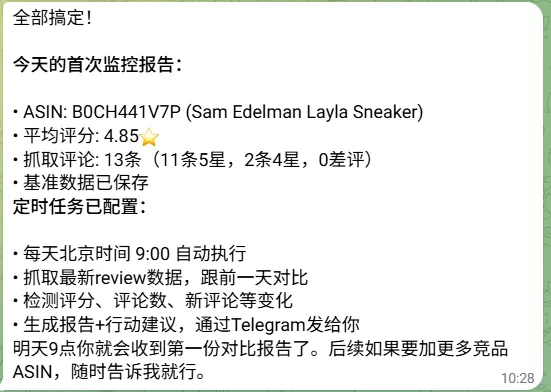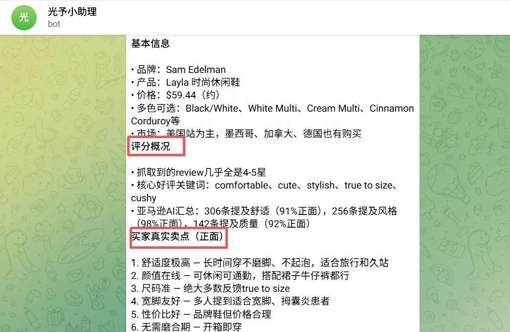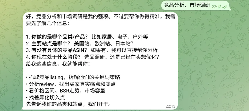 现在,你只需要丢一个 ASIN 给 Telegram 机器人,它就能一键直出一份深度的产品分析报告。