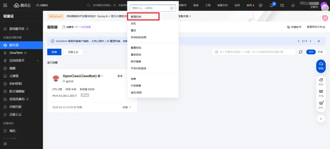 点击服务器右上角登录旁边的三个点,选择管理实例