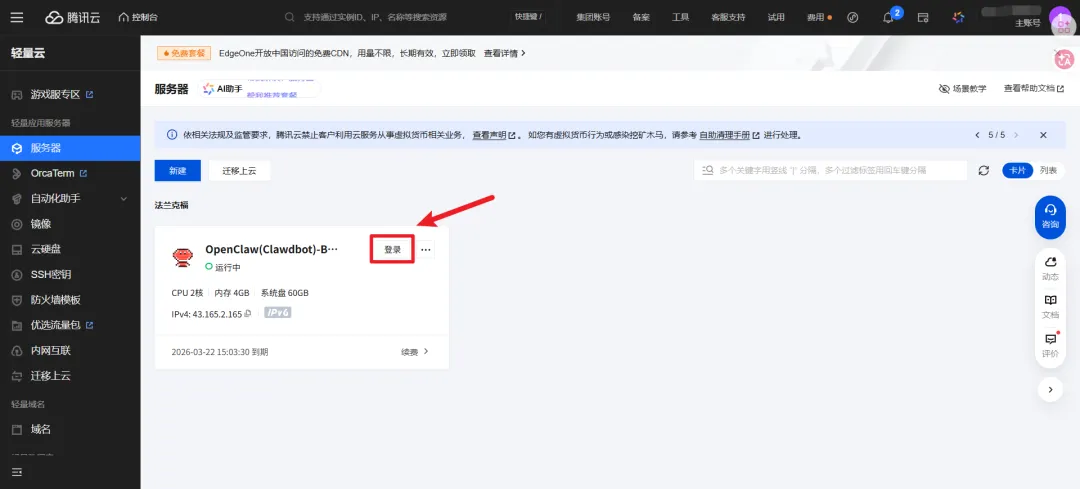 点击服务器右上角的登录,即可进入到云服务器的终端页面