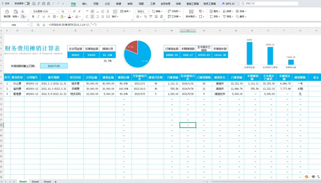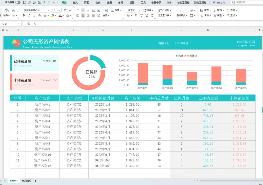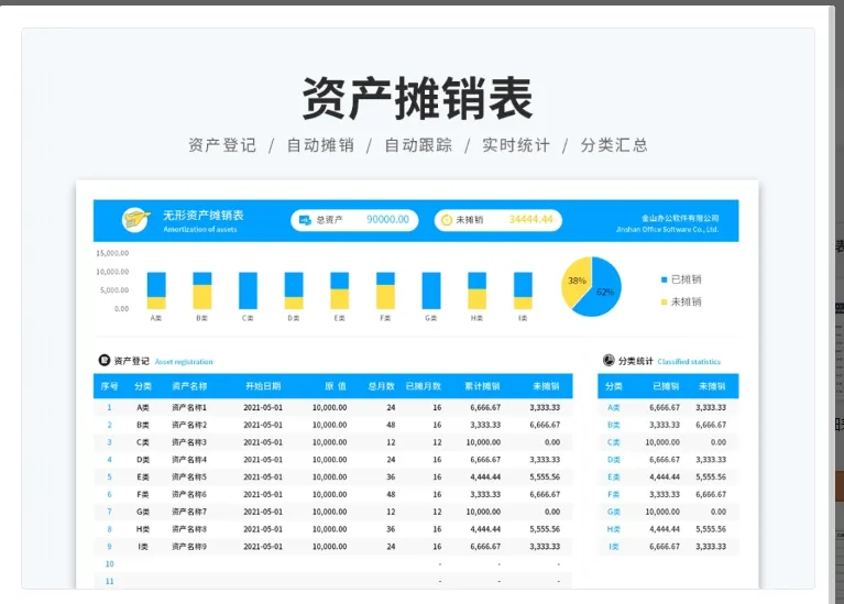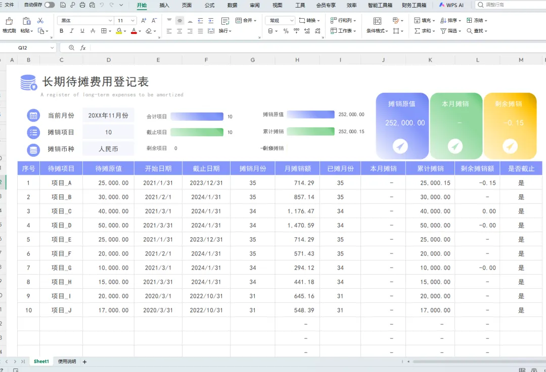 财务常用Excel表格:费用摊销表模板,含财务费用摊销自动计算表、公司无形资产摊销统计表、期间费用分摊表、长期待摊费用摊销表,可套用!