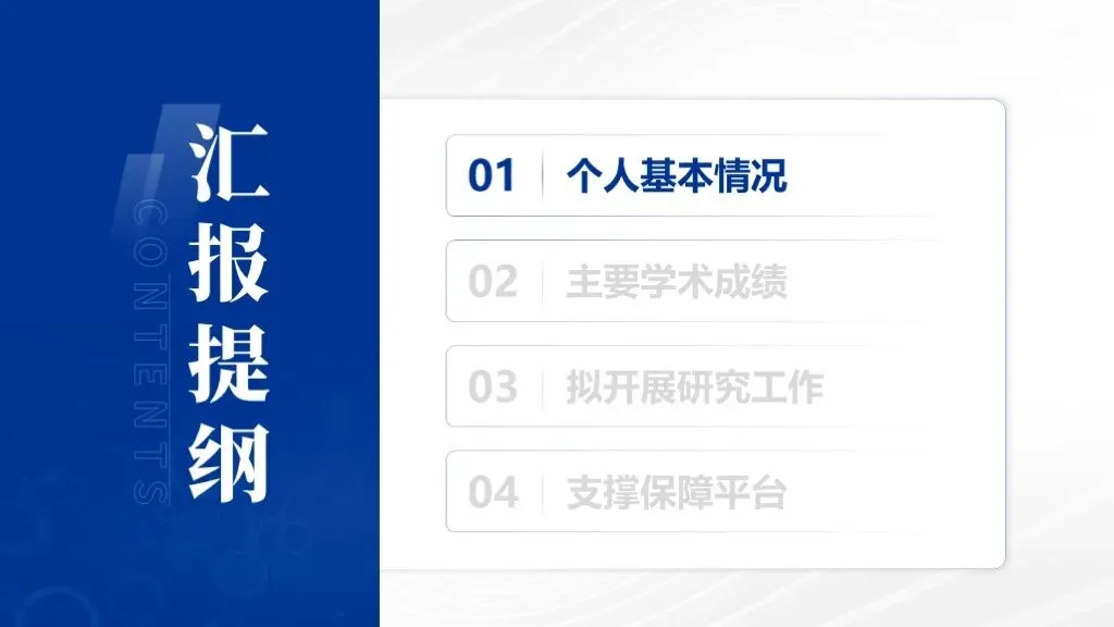 PPT以“个人基本情况-主要学术成绩-拟开展工作”为主线,严格遵循项目申请答辩的规范逻辑,确保从背景到成果再到规划的叙事连贯性。