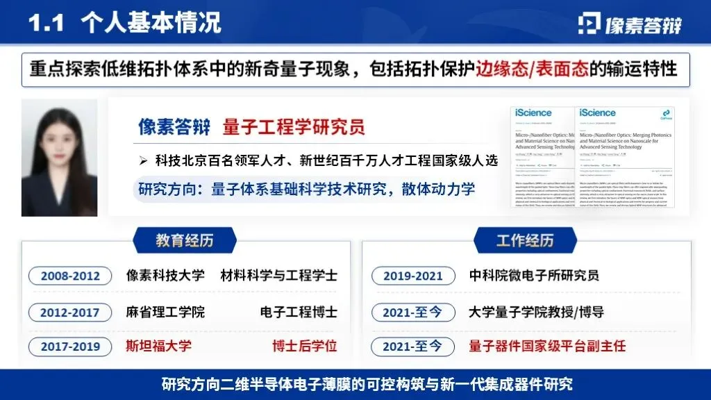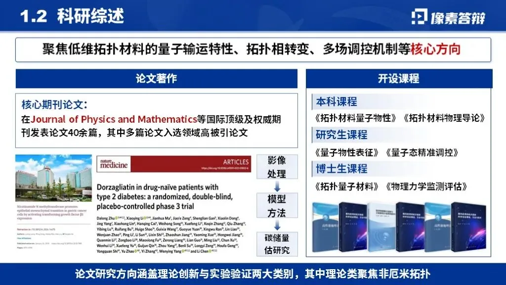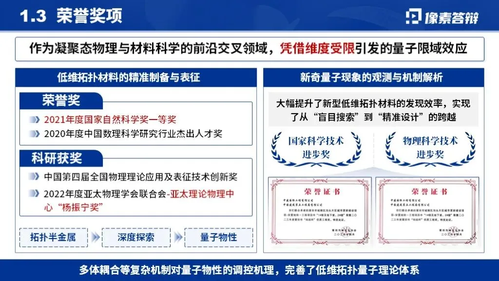 深度融合理论创新与实验验证,通过论文发表、荣誉奖项、技术突破(如拓扑超稳定磁调控)等多维度量化证据,系统展示学术实力与研究价值。