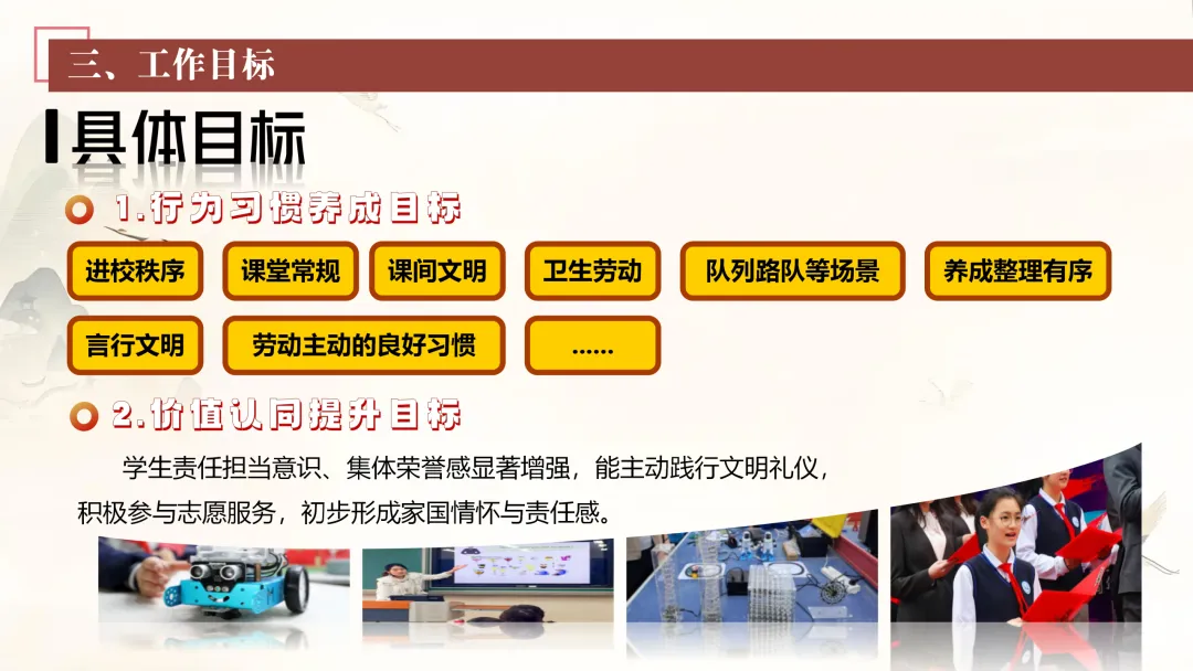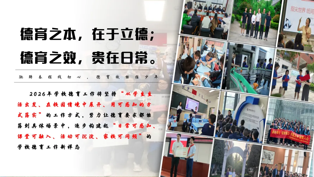 德育之本,在于立德;德育之效,贵在日常。2026年学校德育工作将坚持“从学生生活出发、在校园情境中展开、用可感知的方式落实”的工作方式。我们深知,德育不是空洞的说教,而是要融入学生的日常生活,让学生在真实的情境中体验、感悟和成长。我们将努力让德育要求都能落到具体场景中,逐步构建起“日常可感知、课堂可融入、活动可沉淀、家校可同频”的学校德育工作新样态。