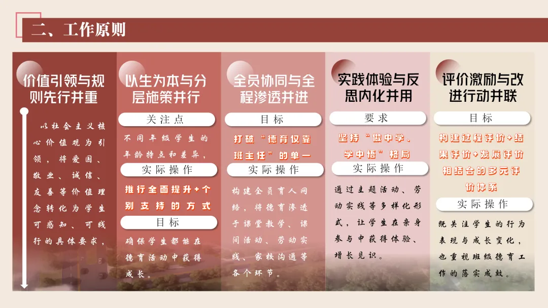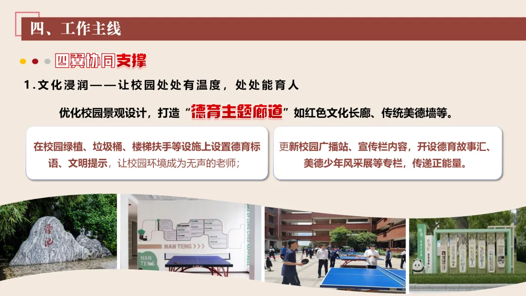 1.优化校园环境:我们将优化校园景观设计,打造红色文化长廊、传统美德墙等德育阵地。在校园绿植、垃圾桶、楼梯扶手等设施上设置德育标语、文明提示,让校园环境成为无声的老师。