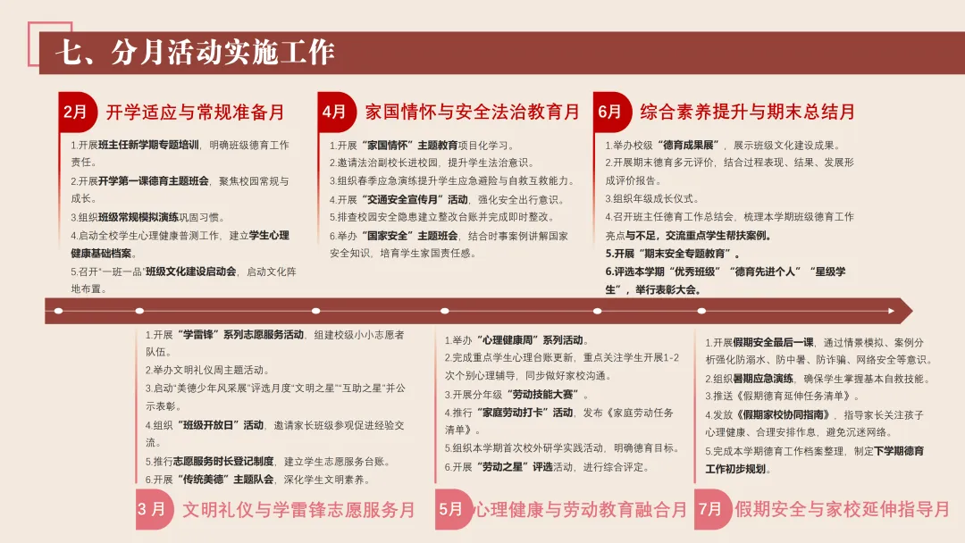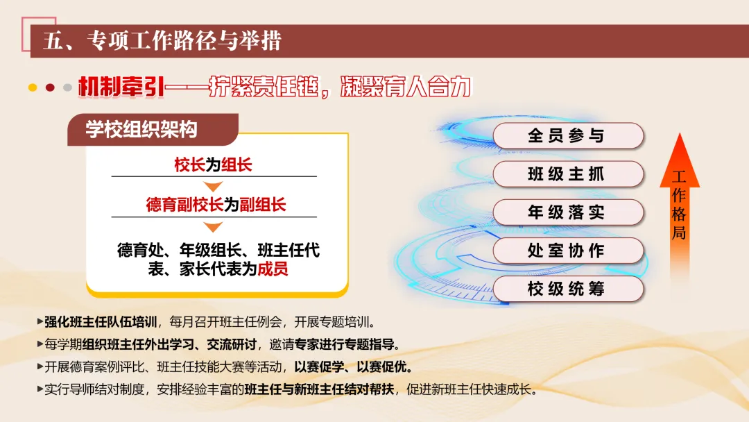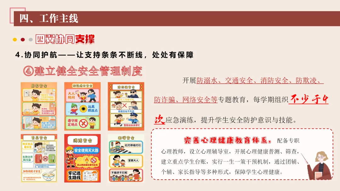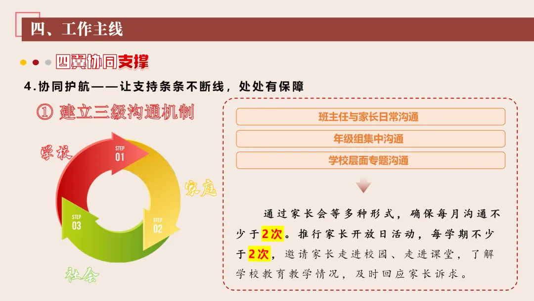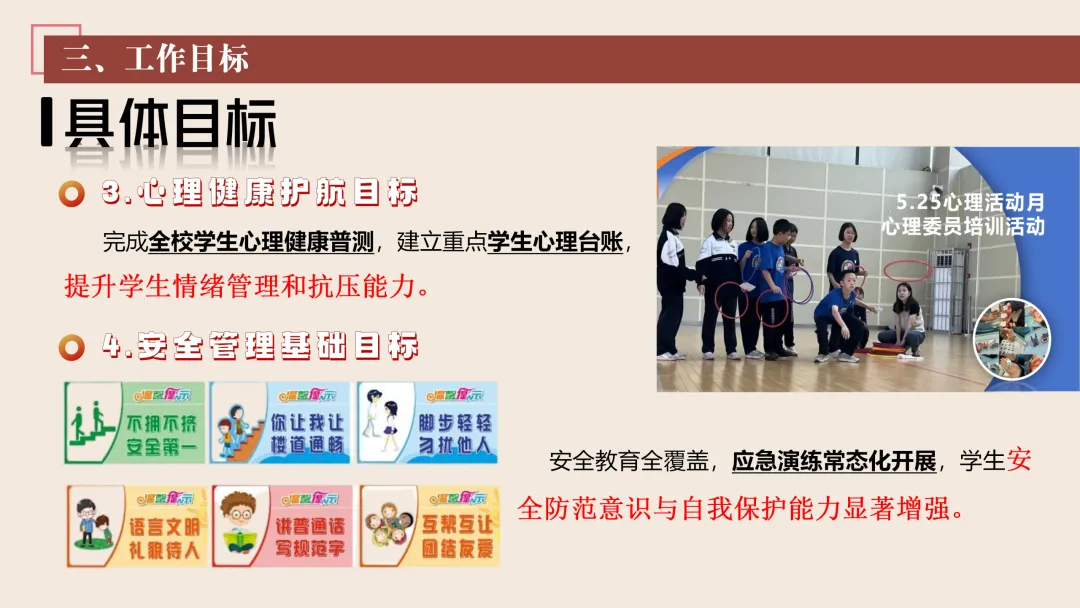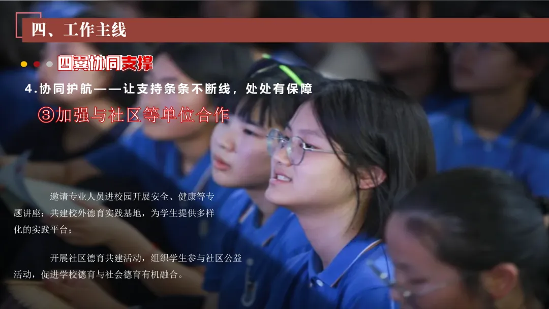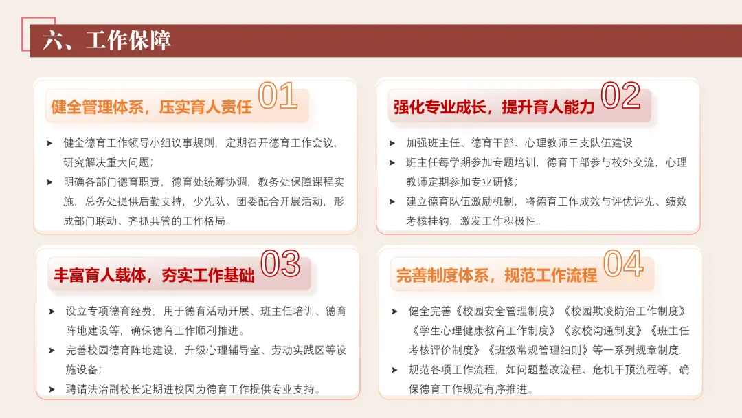 协同护航:我们将让支持条条不断线,处处有保障。我们将加强班主任与家长的日常沟通,年级组集中沟通,学校层面专题沟通。通过家长会等多种形式,确保每月沟通不少于2次。推行家长开放日活动,每学期不少于2次,邀请家长走进校园、走进课堂,了解学校教育教学情况,及时回应家长诉求。我们还将邀请优秀班主任、优秀家长开展讲座、分享经验。开设家长沙龙,满足不同家长的学习需求,提升家长家庭教育水平。我们将邀请专业人员进校园开展安全、健康等专题讲座;共建校外德育实践基地,为学生提供多样化的实成帮扶合力。 3. 规范学生日常行为:我们将在进校秩序上设置护导点位,规范早到学生“静心到班”行为,杜绝追逐、插队、喧哗等问题。课堂常规明确课前准备、课堂发言、课堂纪律、课后整理四项要求,推行桌面清、发言勤、纪律好、作业优的课堂评价标准。划定课间活动区域,明确靠右慢行、不奔跑、不打闹、不喧哗等规则,设置文明督导岗,及时纠正不文明行为。培养学生“有序排队、按需取餐、不挑食、不浪费、餐后整理”的就餐习惯,推行“光盘行动”打卡活动。规范上学、放学、集会时的队列要求,做到“快、静、齐”,培养学生集体意识与规则意识。 4. 加强心理健康教育:我们将以呵护心灵、快乐成长为主题,构建“普测—筛查—团P33:工作保障