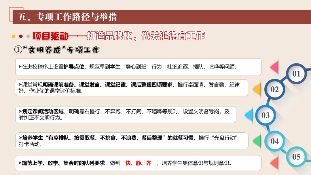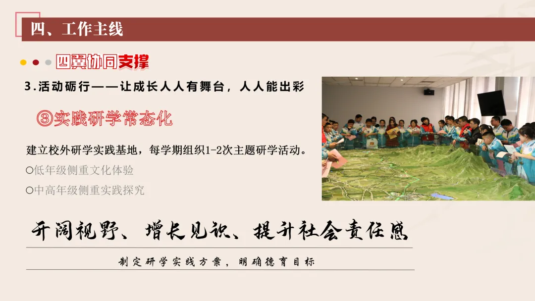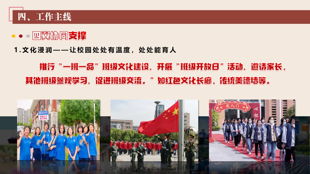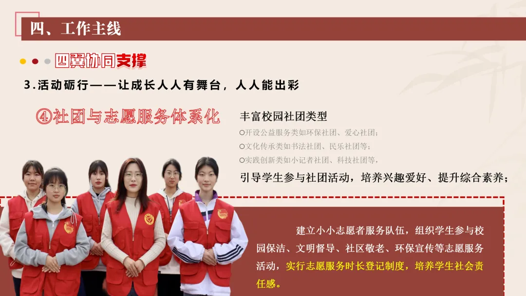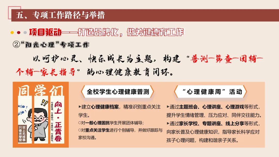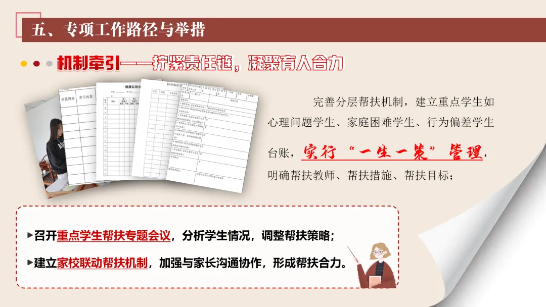 协同护航:我们将让支持条条不断线,处处有保障。我们将加强班主任与家长的日常沟通,年级组集中沟通,学校层面专题沟通。通过家长会等多种形式,确保每月沟通不少于2次。推行家长开放日活动,每学期不少于2次,邀请家长走进校园、走进课堂,了解学校教育教学情况,及时回应家长诉求。我们还将邀请优秀班主任、优秀家长开展讲座、分享经验。开设家长沙龙,满足不同家长的学习需求,提升家长家庭教育水平。我们将邀请专业人员进校园开展安全、健康等专题讲座;共建校外德育实践基地,为学生提供多样化的实成帮扶合力。 3. 规范学生日常行为:我们将在进校秩序上设置护导点位,规范早到学生“静心到班”行为,杜绝追逐、插队、喧哗等问题。课堂常规明确课前准备、课堂发言、课堂纪律、课后整理四项要求,推行桌面清、发言勤、纪律好、作业优的课堂评价标准。划定课间活动区域,明确靠右慢行、不奔跑、不打闹、不喧哗等规则,设置文明督导岗,及时纠正不文明行为。培养学生“有序排队、按需取餐、不挑食、不浪费、餐后整理”的就餐习惯,推行“光盘行动”打卡活动。规范上学、放学、集会时的队列要求,做到“快、静、齐”,培养学生集体意识与规则意识。 4. 加强心理健康教育:我们将以呵护心灵、快乐成长为主题,构建“普测—筛查—团P33:工作保障
