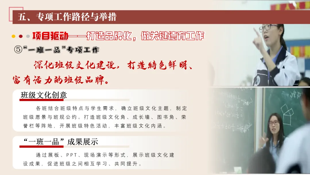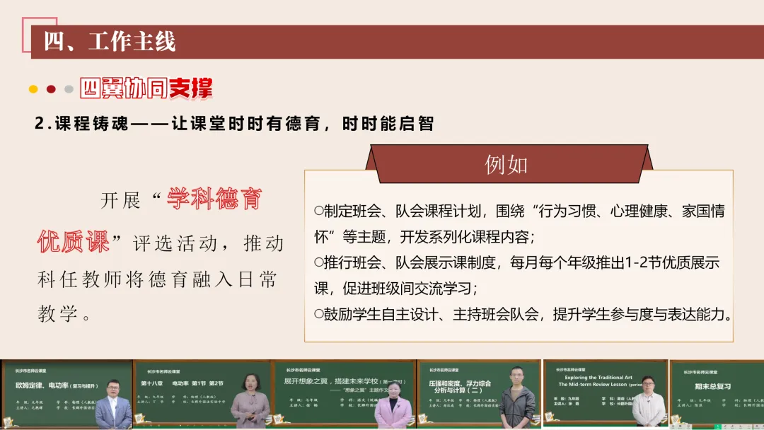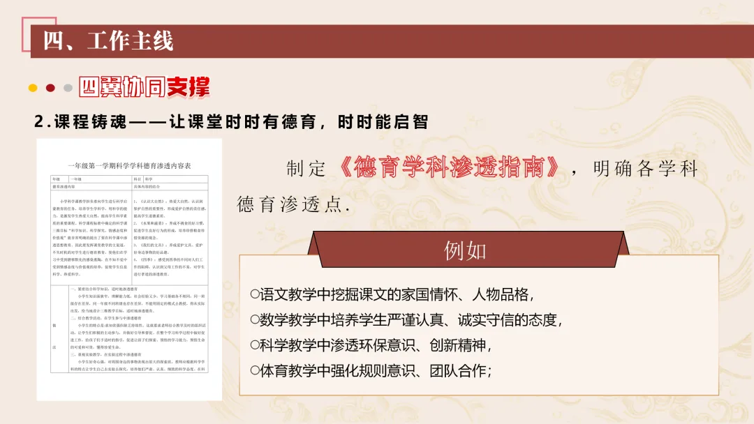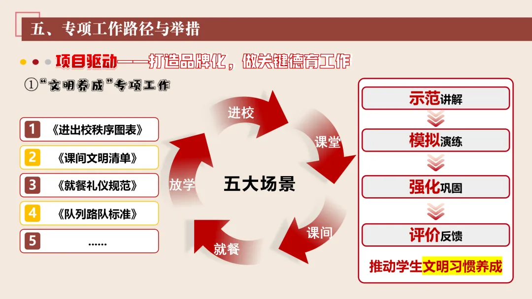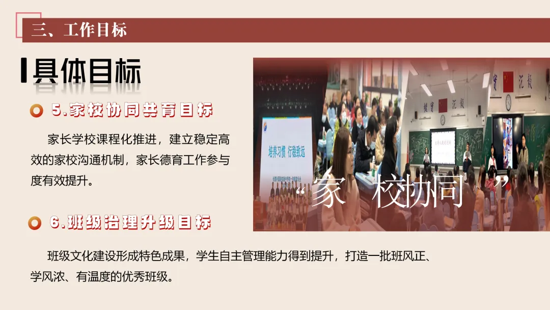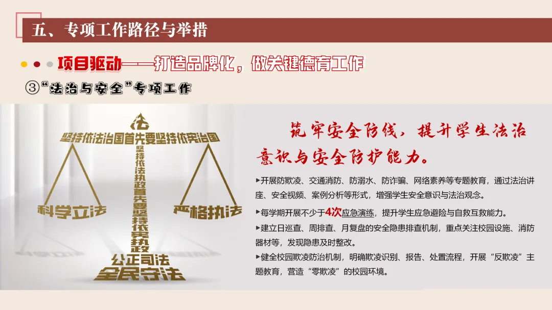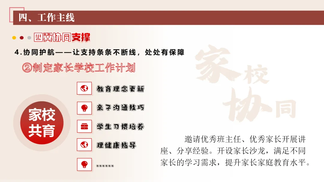 协同护航:我们将让支持条条不断线,处处有保障。我们将加强班主任与家长的日常沟通,年级组集中沟通,学校层面专题沟通。通过家长会等多种形式,确保每月沟通不少于2次。推行家长开放日活动,每学期不少于2次,邀请家长走进校园、走进课堂,了解学校教育教学情况,及时回应家长诉求。我们还将邀请优秀班主任、优秀家长开展讲座、分享经验。开设家长沙龙,满足不同家长的学习需求,提升家长家庭教育水平。我们将邀请专业人员进校园开展安全、健康等专题讲座;共建校外德育实践基地,为学生提供多样化的实成帮扶合力。 3. 规范学生日常行为:我们将在进校秩序上设置护导点位,规范早到学生“静心到班”行为,杜绝追逐、插队、喧哗等问题。课堂常规明确课前准备、课堂发言、课堂纪律、课后整理四项要求,推行桌面清、发言勤、纪律好、作业优的课堂评价标准。划定课间活动区域,明确靠右慢行、不奔跑、不打闹、不喧哗等规则,设置文明督导岗,及时纠正不文明行为。培养学生“有序排队、按需取餐、不挑食、不浪费、餐后整理”的就餐习惯,推行“光盘行动”打卡活动。规范上学、放学、集会时的队列要求,做到“快、静、齐”,培养学生集体意识与规则意识。 4. 加强心理健康教育:我们将以呵护心灵、快乐成长为主题,构建“普测—筛查—团P33:工作保障