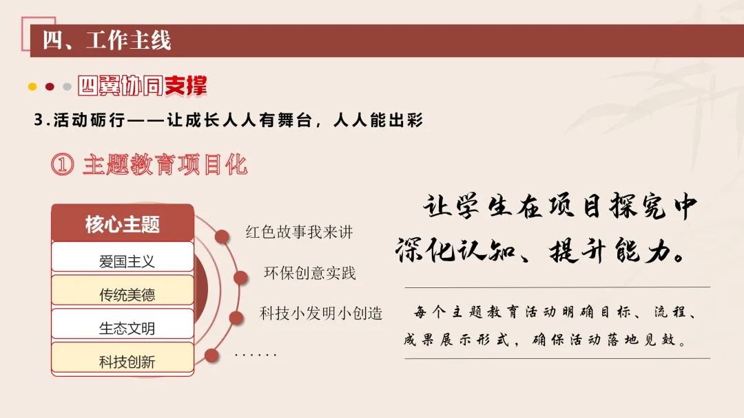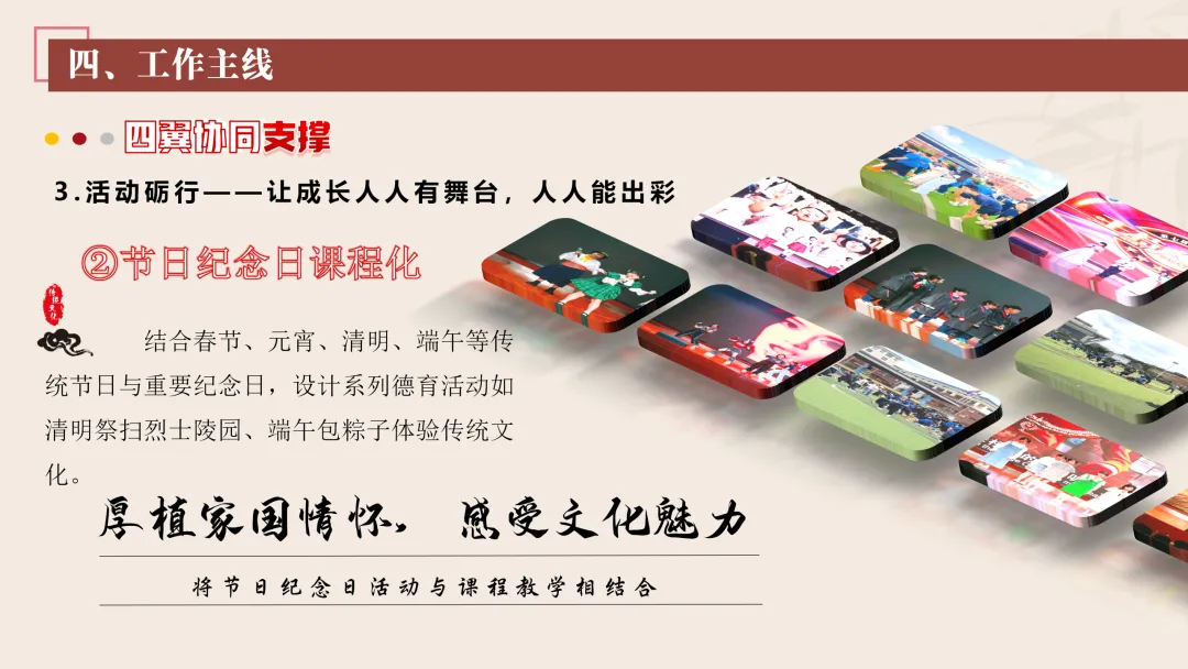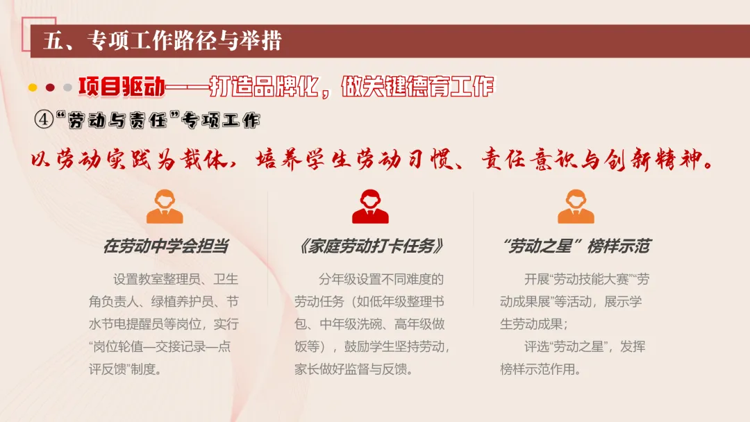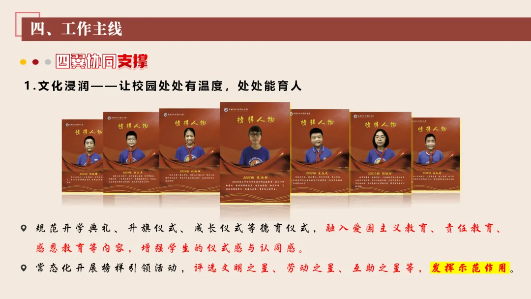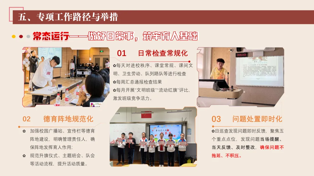2.丰富校园文化活动:我们将更新校园广播站、宣传栏内容,开设德育故事汇、美德少年风采展等专栏,传递正能量。同时,我们也将规范开学典礼、升旗仪式、成长仪式等德育仪式,融入爱国主义教育、责任教育、感恩教育等内容,增强学生的仪式感与认同感。常态化开展榜样引领活动,评选文明之星、劳动之星、互助之星等,发挥示范作用。