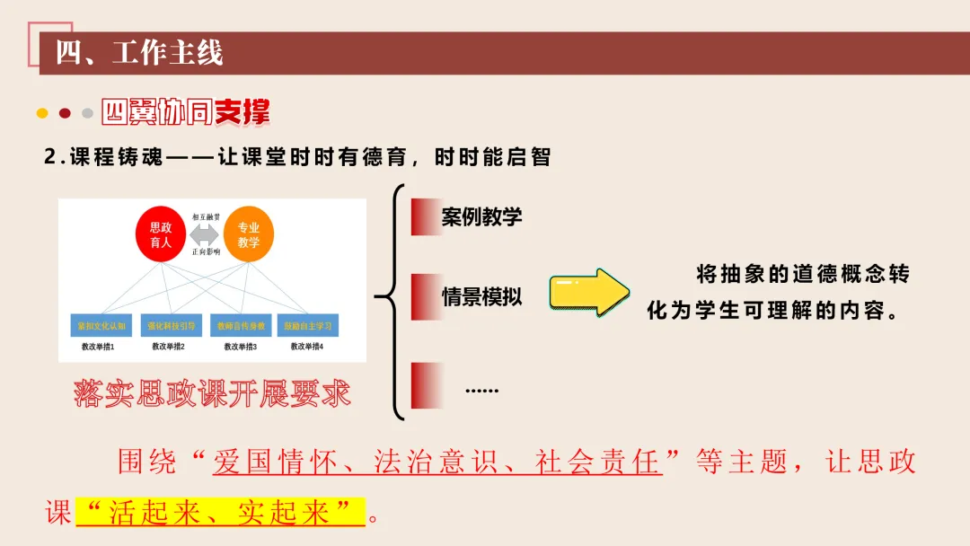 六、工作保障 1. 健全管理体系:我们将健全德育工作领导小组议事规则,定期召开德育工作会议,研究解决重大问题。明确各部门德育职责,德育处统筹协调,教务处保障课程实施,总务处提供后勤支持,少先队、团委配合开展活动,形成部门联动、齐抓共管的工作格局。 2. 丰富育人载体:我们将设立专项德育经费,用于德育活动开展、班主任培训、德育阵地建设等,确保德育工作顺利推进。完善校园德育阵地建设,升级心理辅导室、劳动实践区等设施设备。聘请法治副校长定期进完整版可编辑电子资料 获取方式:
