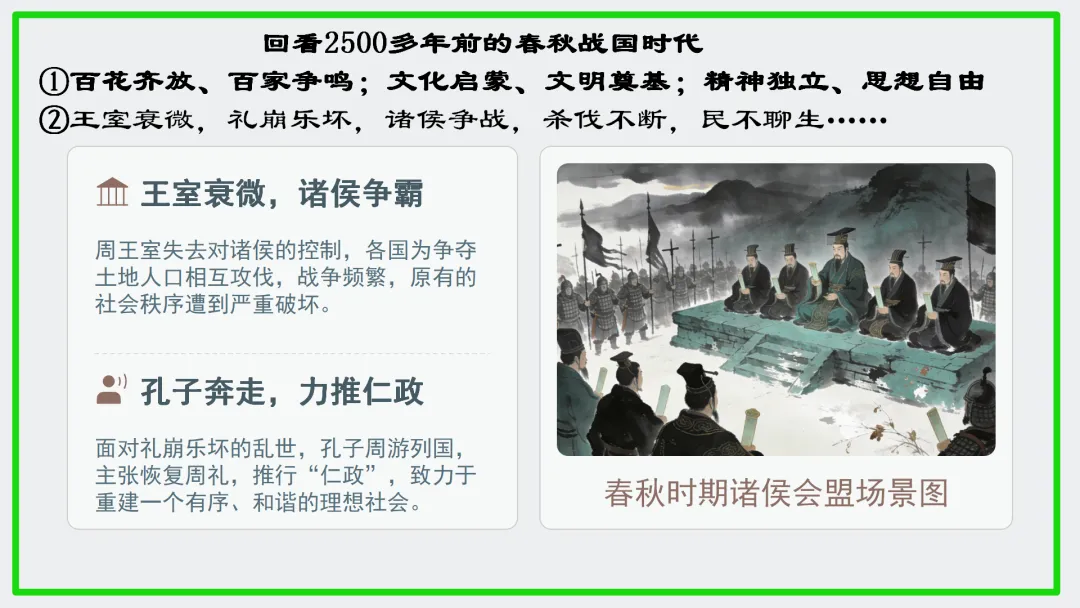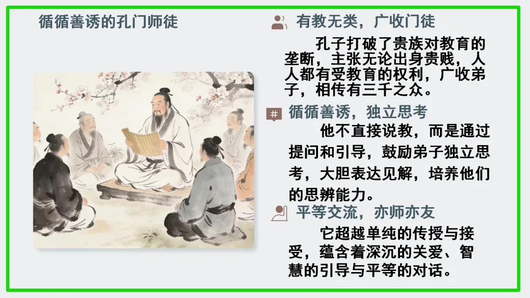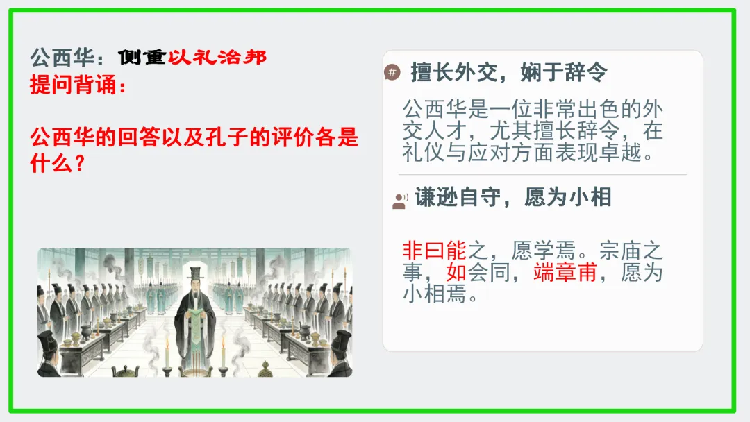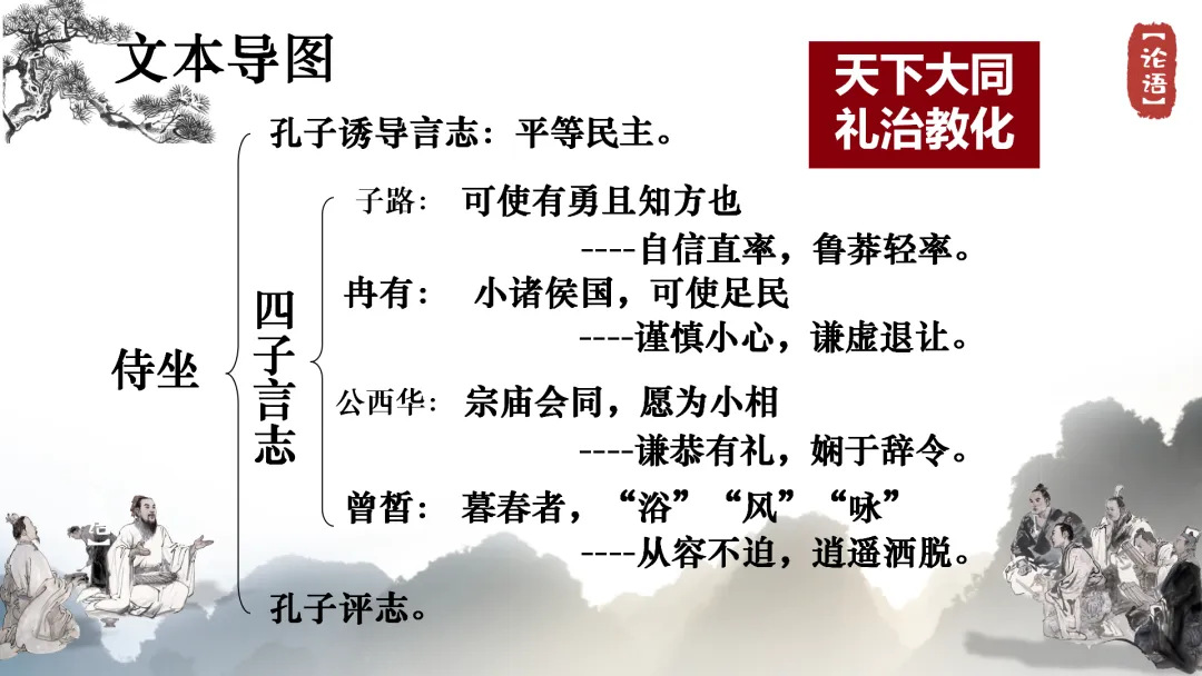 •师生共同回顾:本文通过一次春日侍坐,展现了四位弟子的不同志向和孔子的评价标准,核心在于“礼”与“和”的儒家思想。