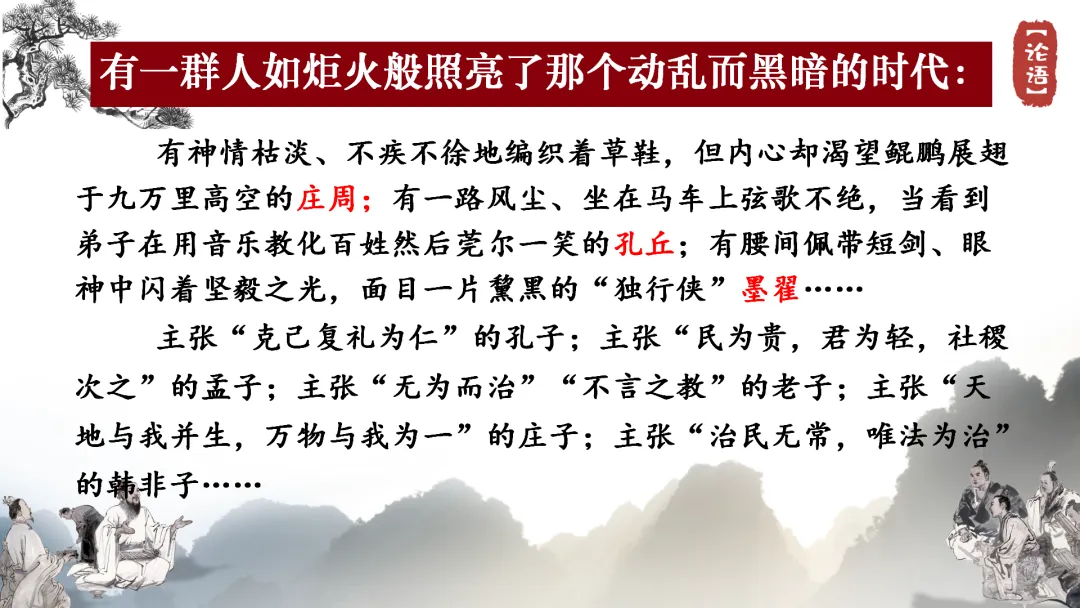 【时代背景】春秋之末,天下大乱。周王朝衰微,诸侯并起,纷争不断,战火四起,社会动荡,礼崩乐坏。当时的社会实际,最期待可行的也不过是“乐岁终身饱,凶年免于死亡”,因为实际情况恰恰是饥馑之年“老弱转乎沟壑,壮者散而之四方”。