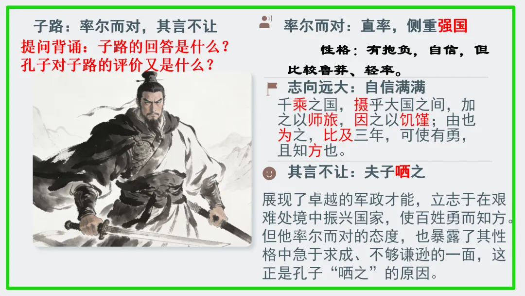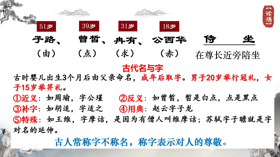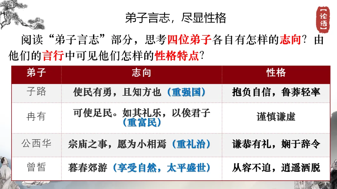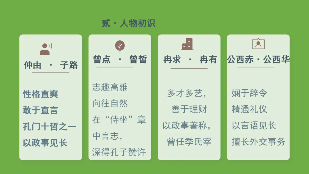 •PPT依次展示,介绍四位弟子的性格特点:子路的率直、冉有的谦逊、公西华的儒雅、曾皙的洒脱。