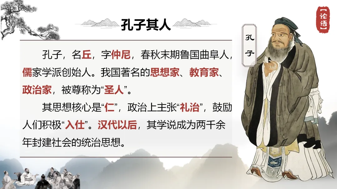 孔子(前551年~前479年),名丘,字仲尼。春秋末期鲁国陬邑(今山东曲阜)人,儒家学派的创始人,我国著名的思想家、教育家,被尊称为“圣人”“至圣”“万世师表”。被联合国教科文组织评为“世界十大文化名人之首”。