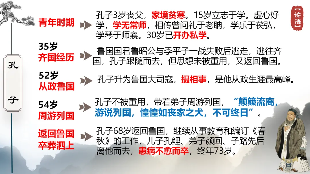 【孔子之行】面对急剧变革的社会现实,孔子试图用自己以“礼”“仁”为核心的政治主张来稳定社会秩序 ,他周游列国,推销儒道,却屡屡碰壁。