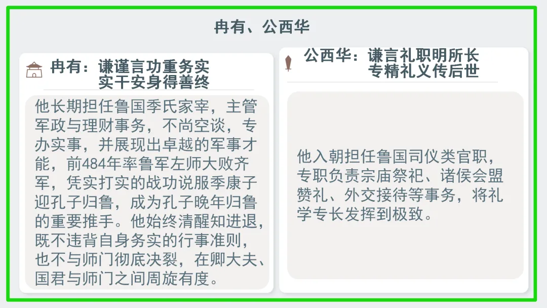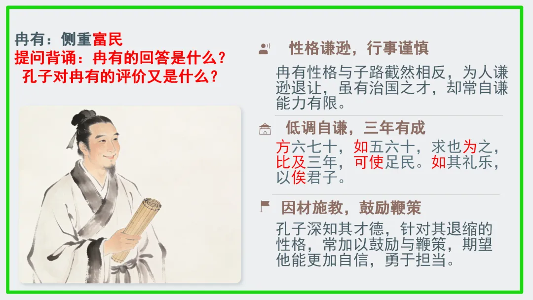 冉有 | 可使足民。如其礼乐,以俟君子(重富民) | 谨慎谦虚 |