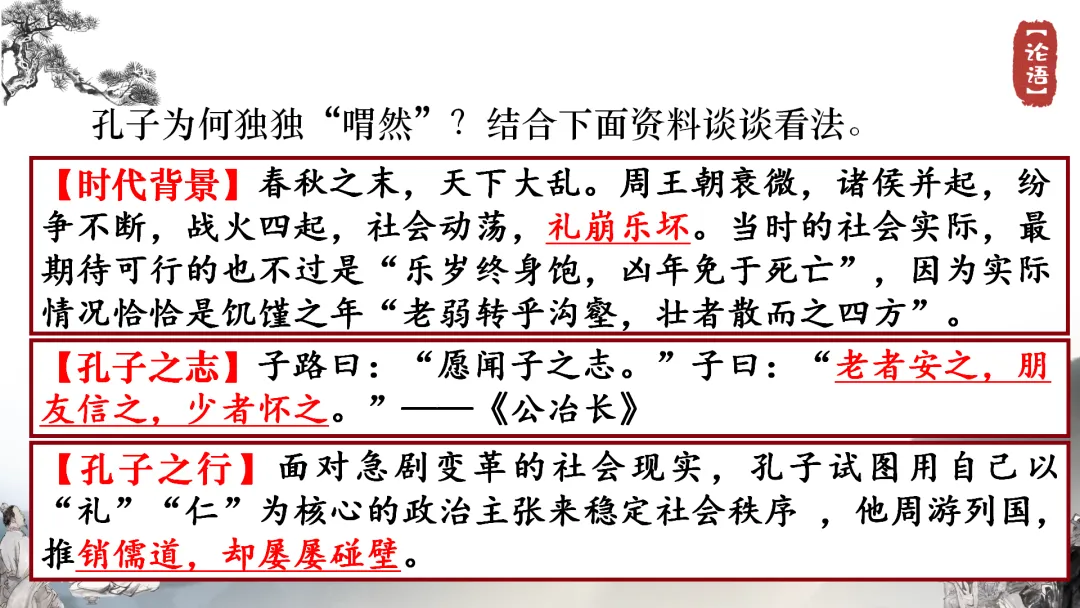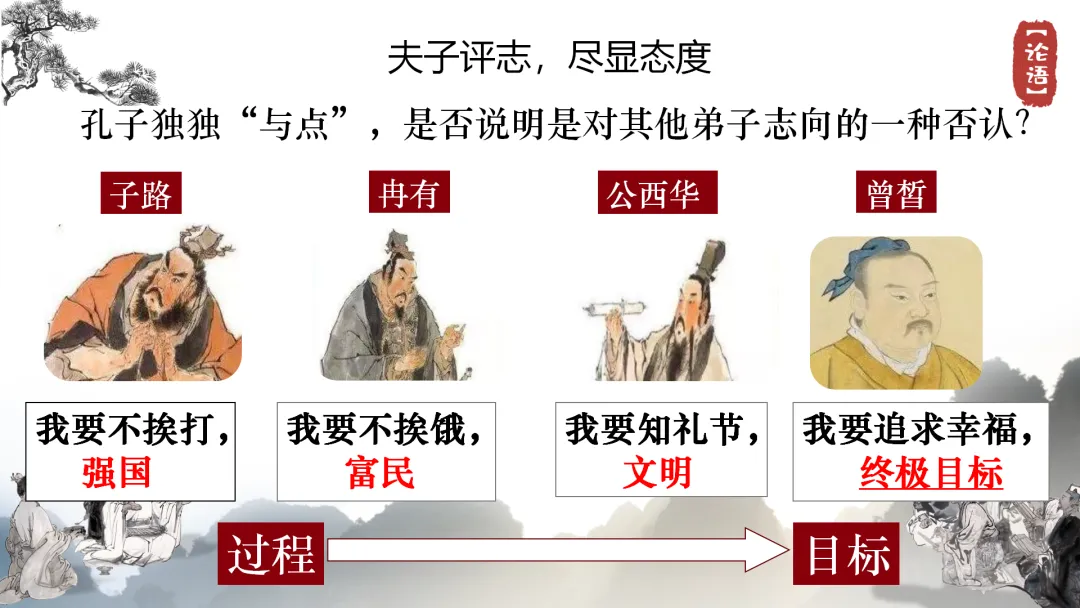 •聚焦核心问题:PPT展示,提问“孔子为何独独赞同曾皙的志向?”